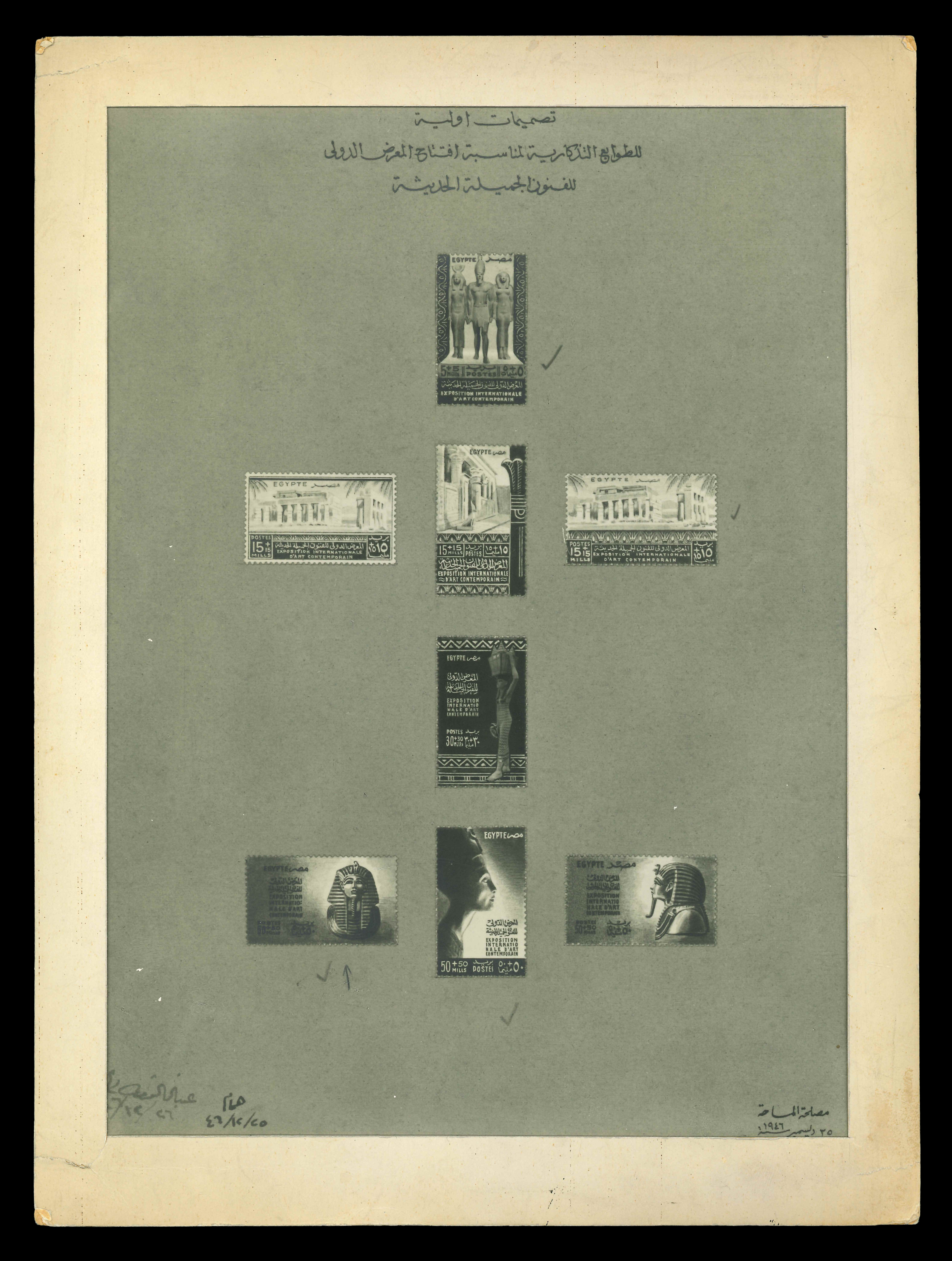 1947 International Exhibition of Fine Art, a photographic presentation card depicting eight proposed stamps, three of which were similar to the accepted designs, unusual and an attractive showpiece (Image 1)