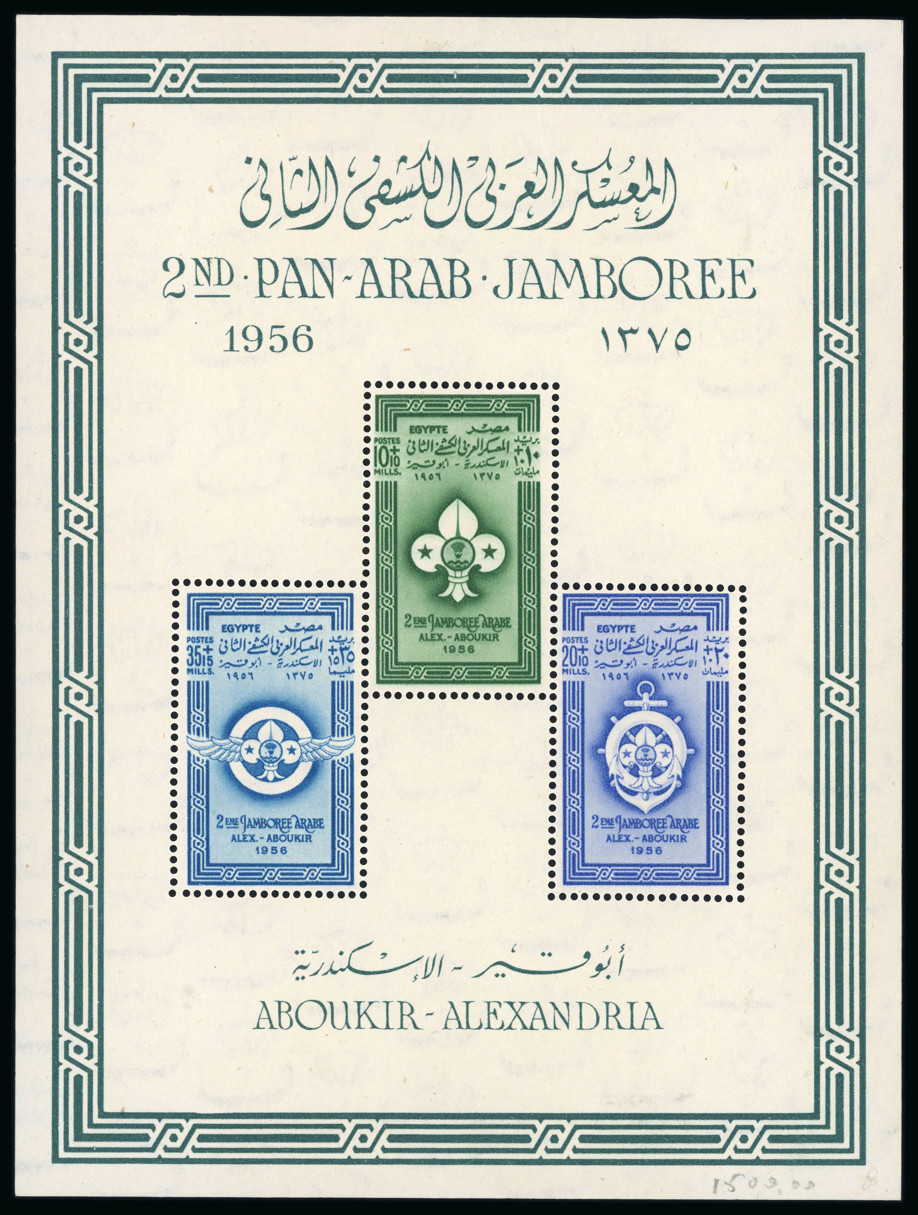 1956 Scouts Jamboree pair of mini sheets (perf. and imperf.), the former with hinge marks, the latter with wrinkling (possibly from being damp) (NP $3'500). (Image 1)