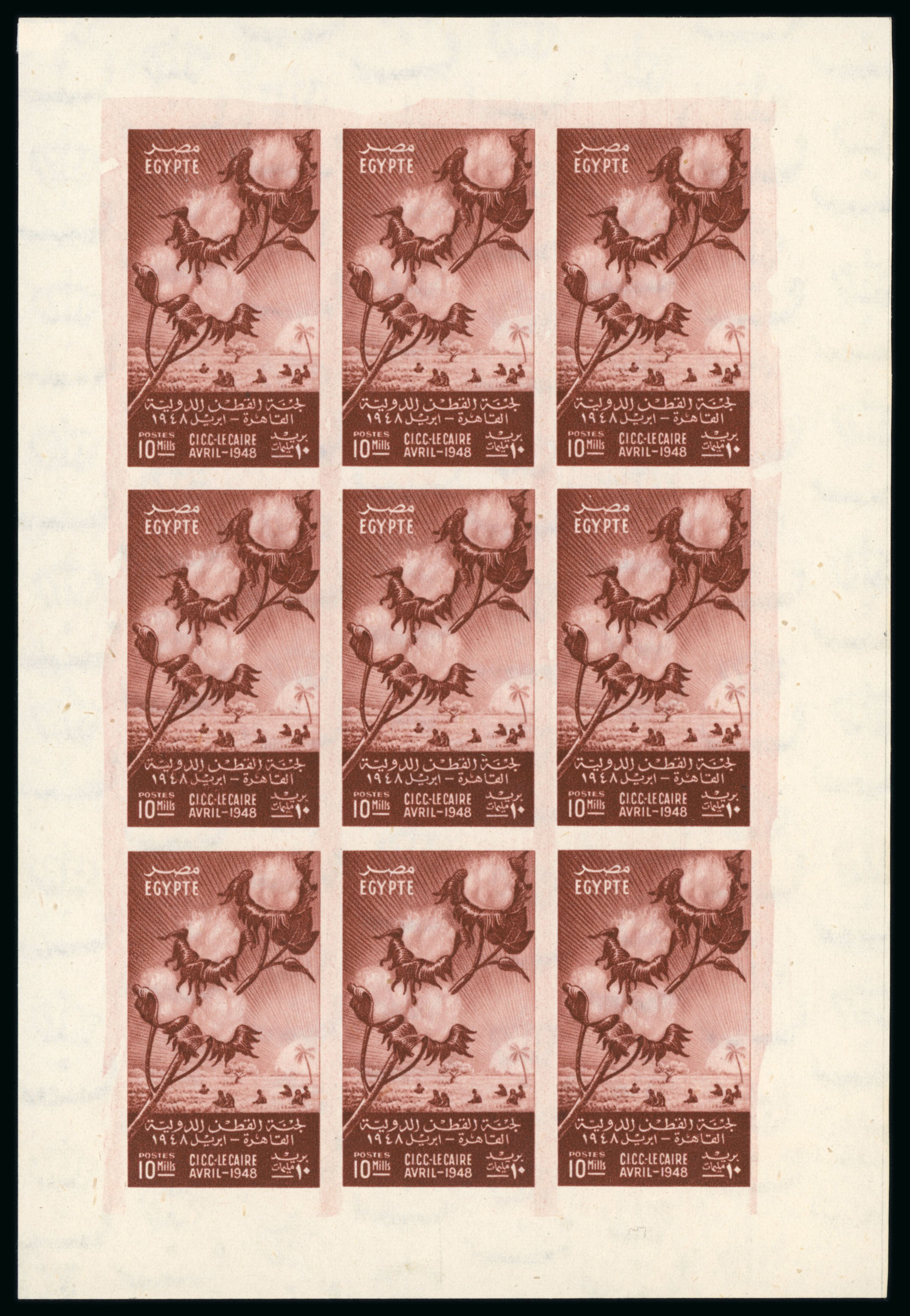 1948 Arab International Cotton Congress in Cairo, 10m red-brown, colour trial, Royal imperforate sheetlet of nine on watermarked paper, some paper adhesion in margin only, very fine and extremely rare as only two such colour trial