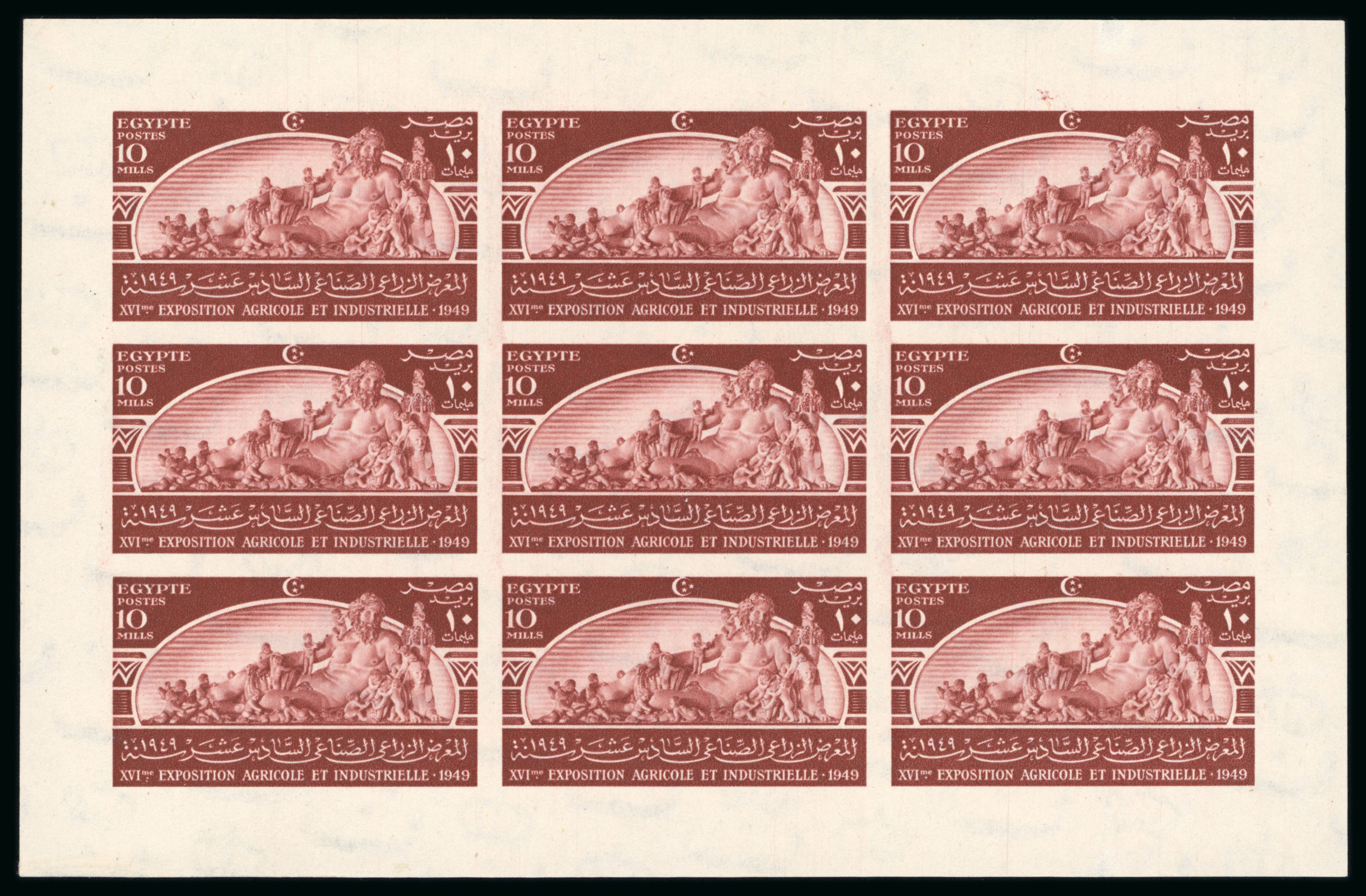 1949 Agricultural and Industrial Exhibition in Cairo, 10m red-brown, colour trial, Royal imperforate sheetlet of nine on watermarked paper, some paper adhesion in margin only, very fine and a unique colour trial sheetlet (Nile Post