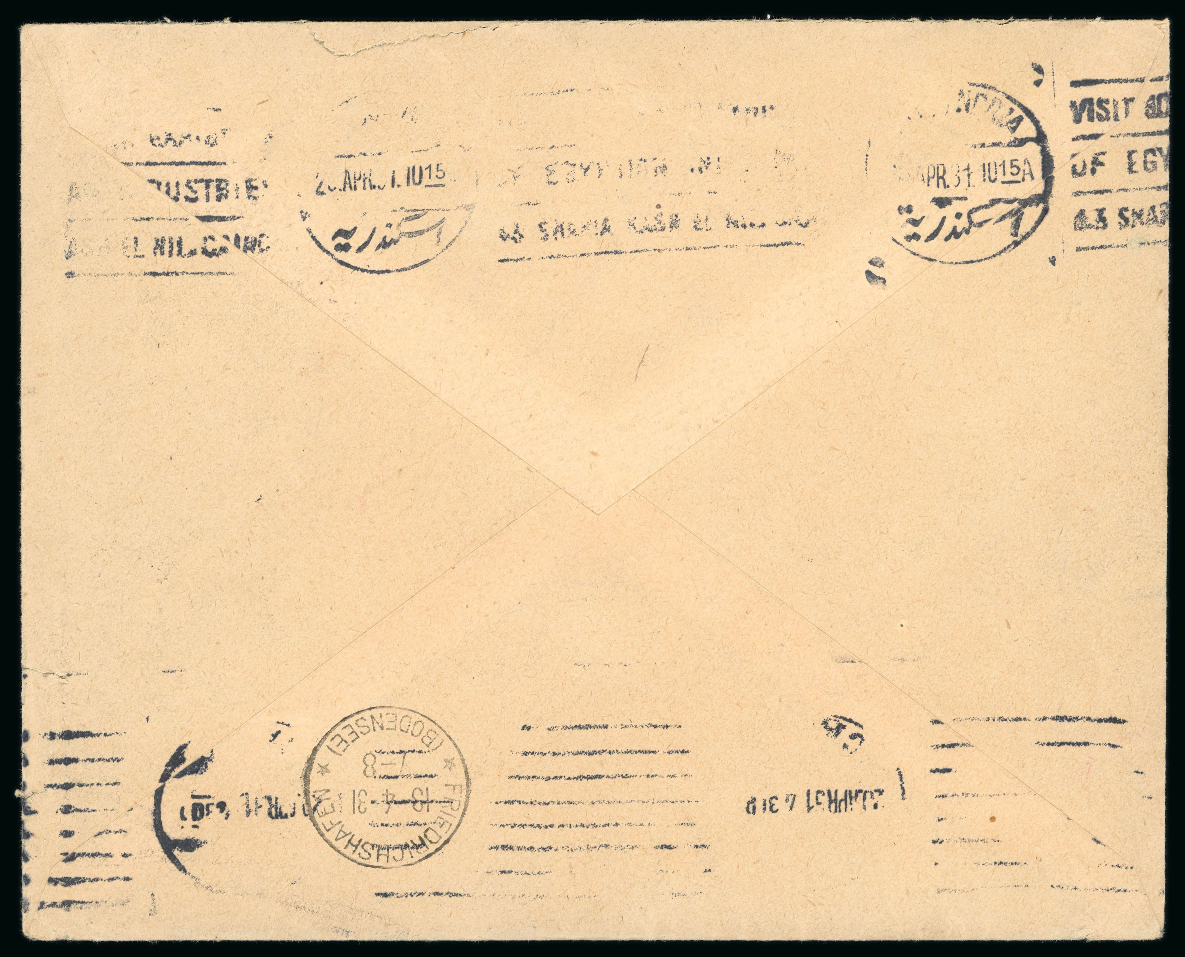 50m on 27m and 100m on 27m tied by Cairo Graf Zeppelin cds, addressed to a passenger onboard with Freidrichshafen arrival, undelivered and returned to Cairo (incl. contents). (Image 1)