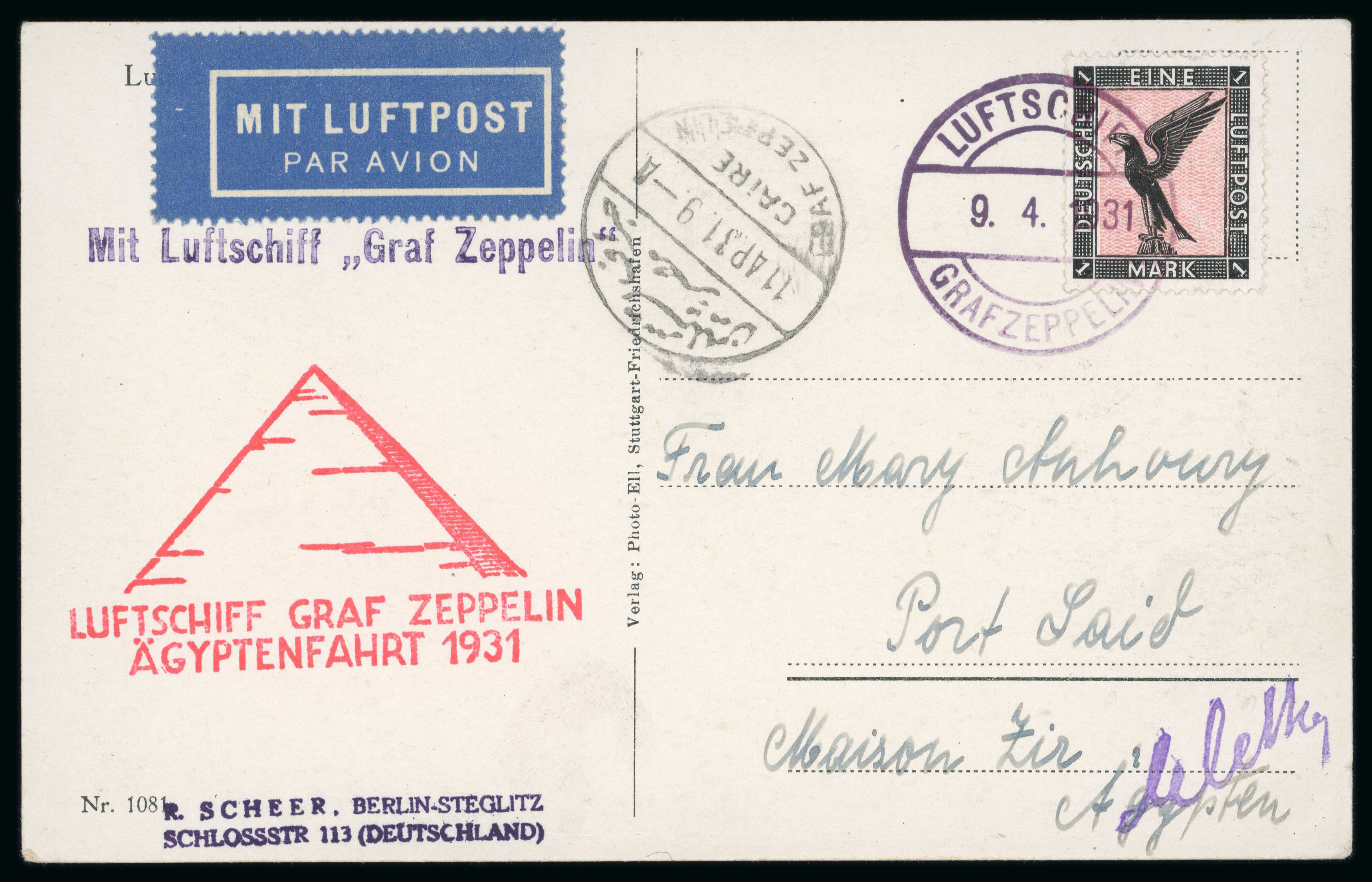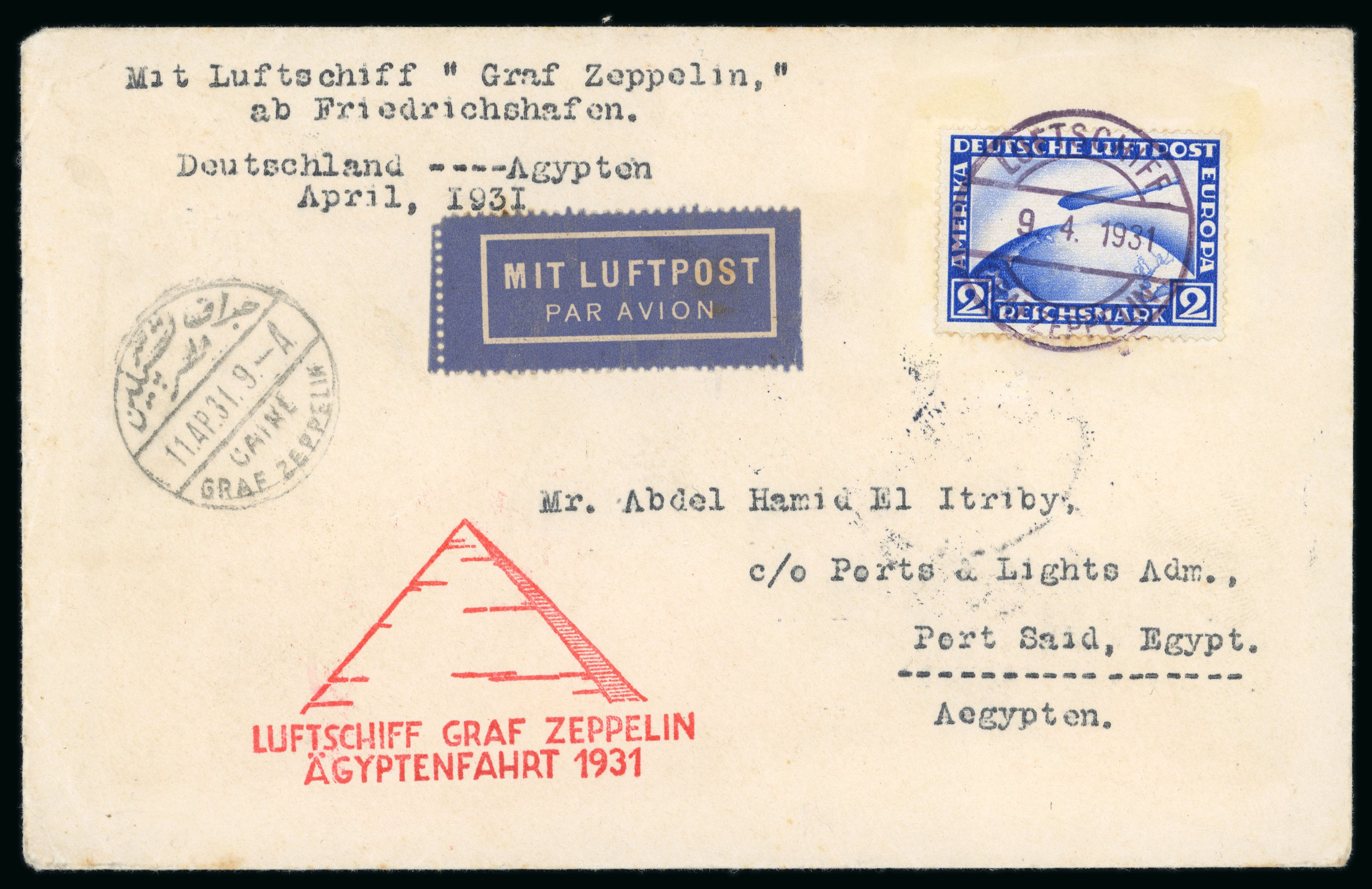 1931 (Apr 9 and 10) Trio of Egypt Flight Zeppelin covers, incl. two incoming from Germany with the red pyramid flight cachet (postcard with 1M and cover with 2M franking), and cover carried on the return flight with 1931 Zeppelin issue