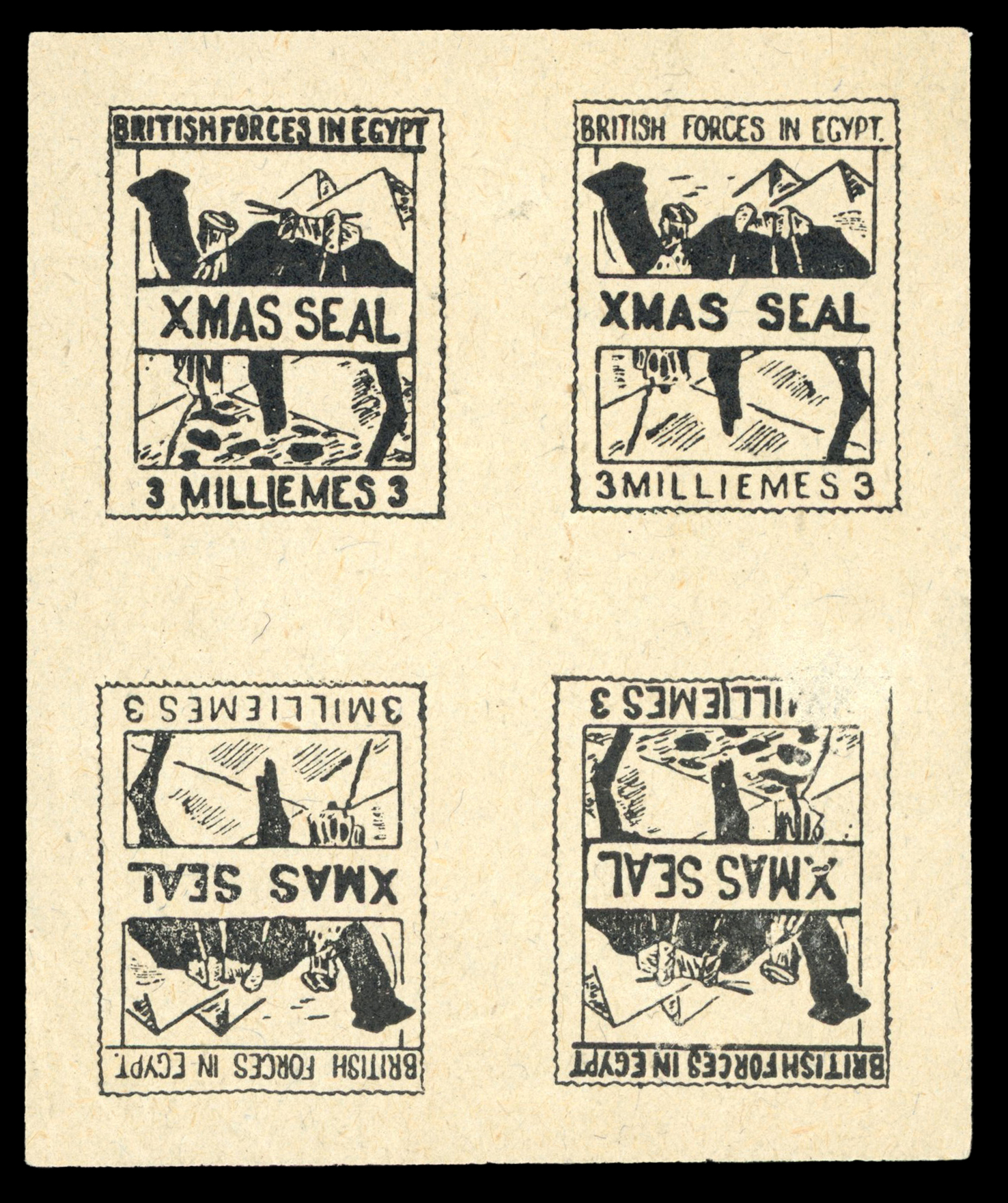 1932 Essay for the British Forces "Christmas Seals": 3m black on grey gummed paper, miniature sheet showing two different designs and with two tete-beche pairs, one thinned, extremely rare showpiece (Image 1)
