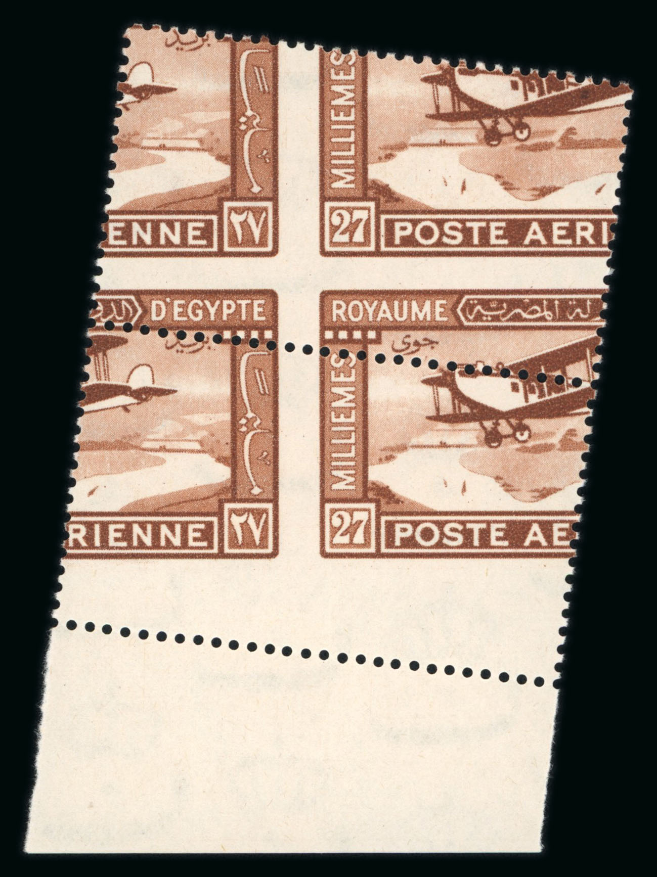1933-38 Airmail 5m chocolate and black, Royal oblique perforations in mint nh bottom right corner sheet marginal plate block of four, numbered in Roman letters A/38, fresh, very fine and an extremely rare control block, only two such