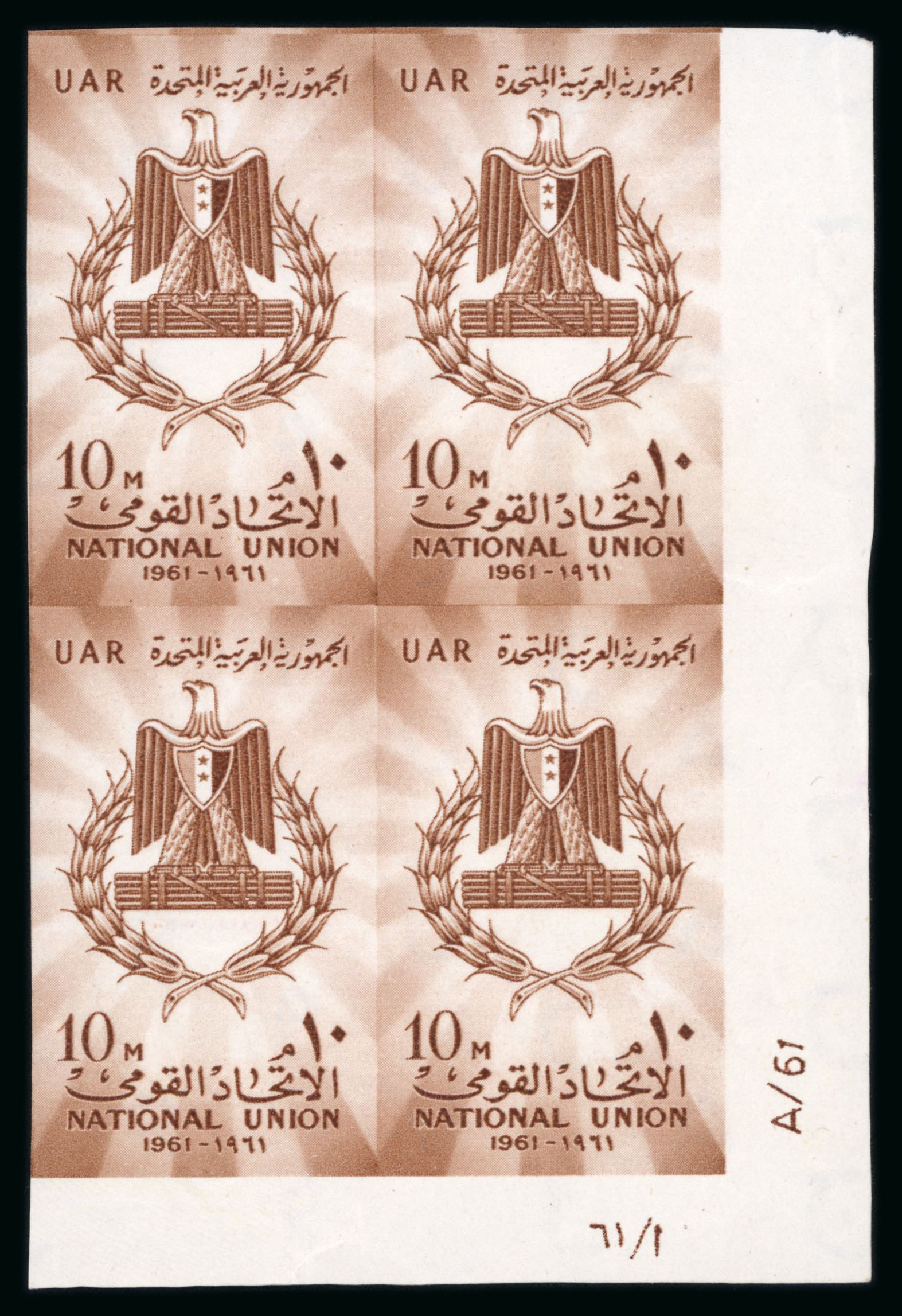1961 National Union, unissued, 10m light brown, mint nh imperforate bottom right corner sheet marginal control block of four, numbered A/61 in Roman and Arabic script, minor gum wrinkles, very fine and a unique plate block (Image 1)
