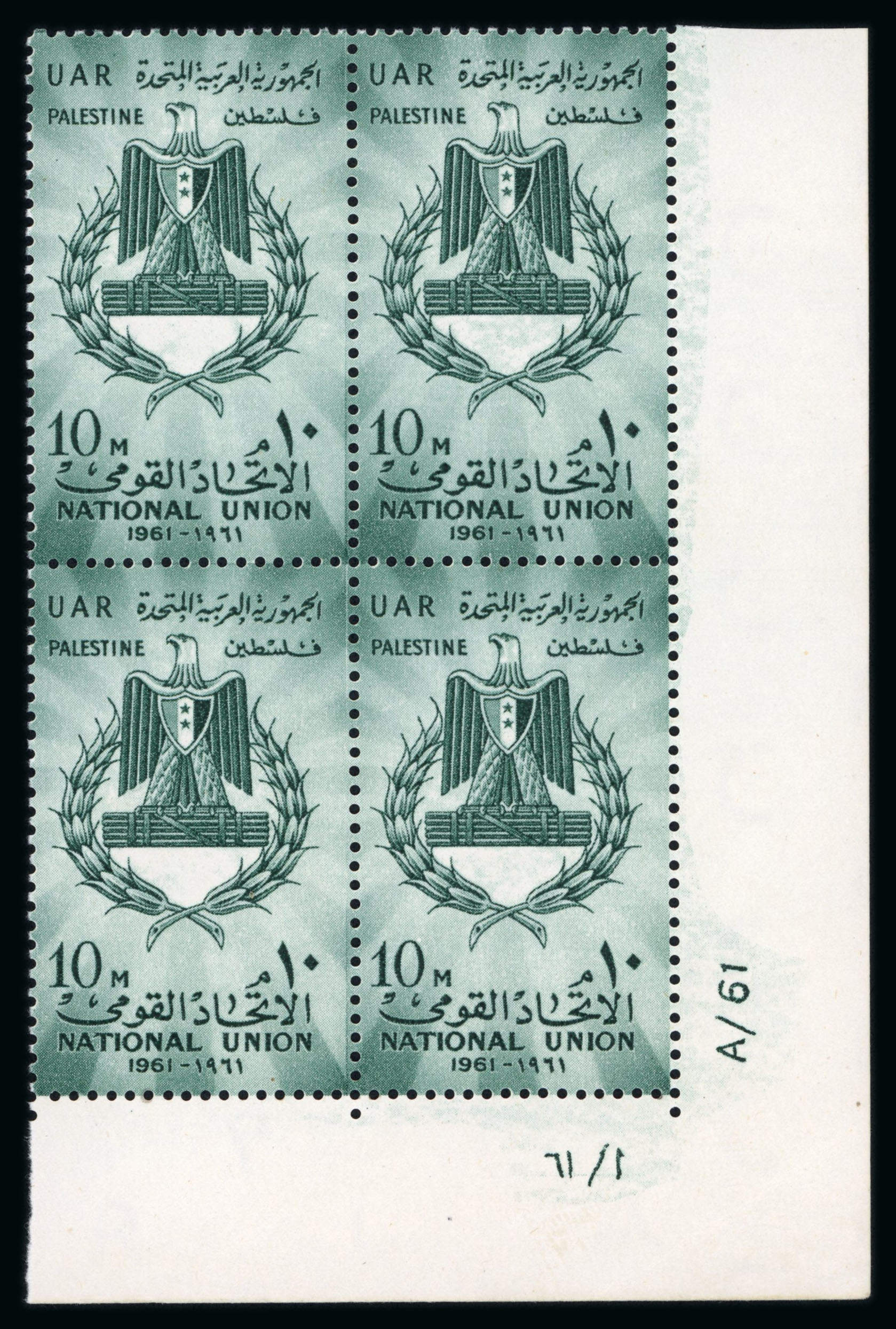 1961 National Union, unissued, 10m blue green, mint nh bottom right corner sheet marginal control block of four, numbered A/61 in Roman and Arabic script, minor gum wrinkles, very fine and a unique plate block (Image 1)