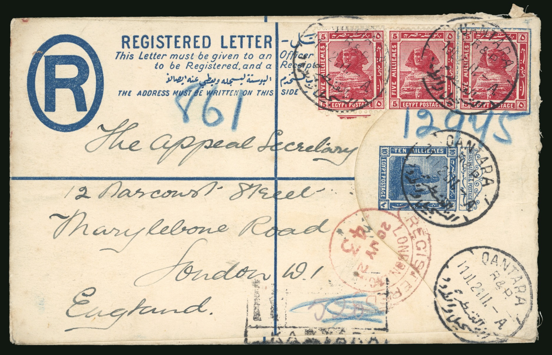 125m. booklet: Harrison 5m lake, three singles from a booklet pane, tied on 10m blue registered envelope by Qantara cds dated 1921 (21.7) to London, England, very fine, attractive and a rare booklet stamp usage. (Image 1)