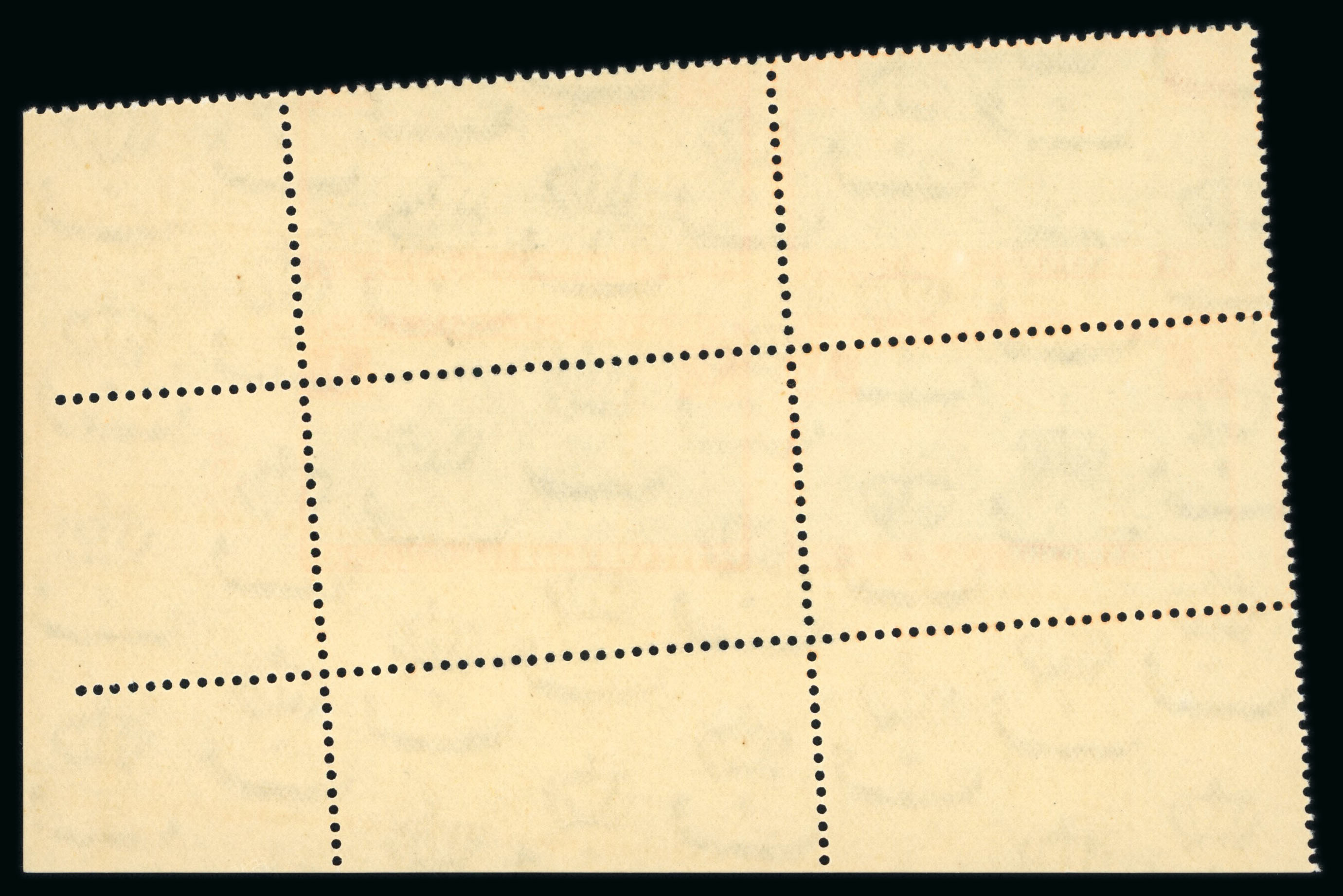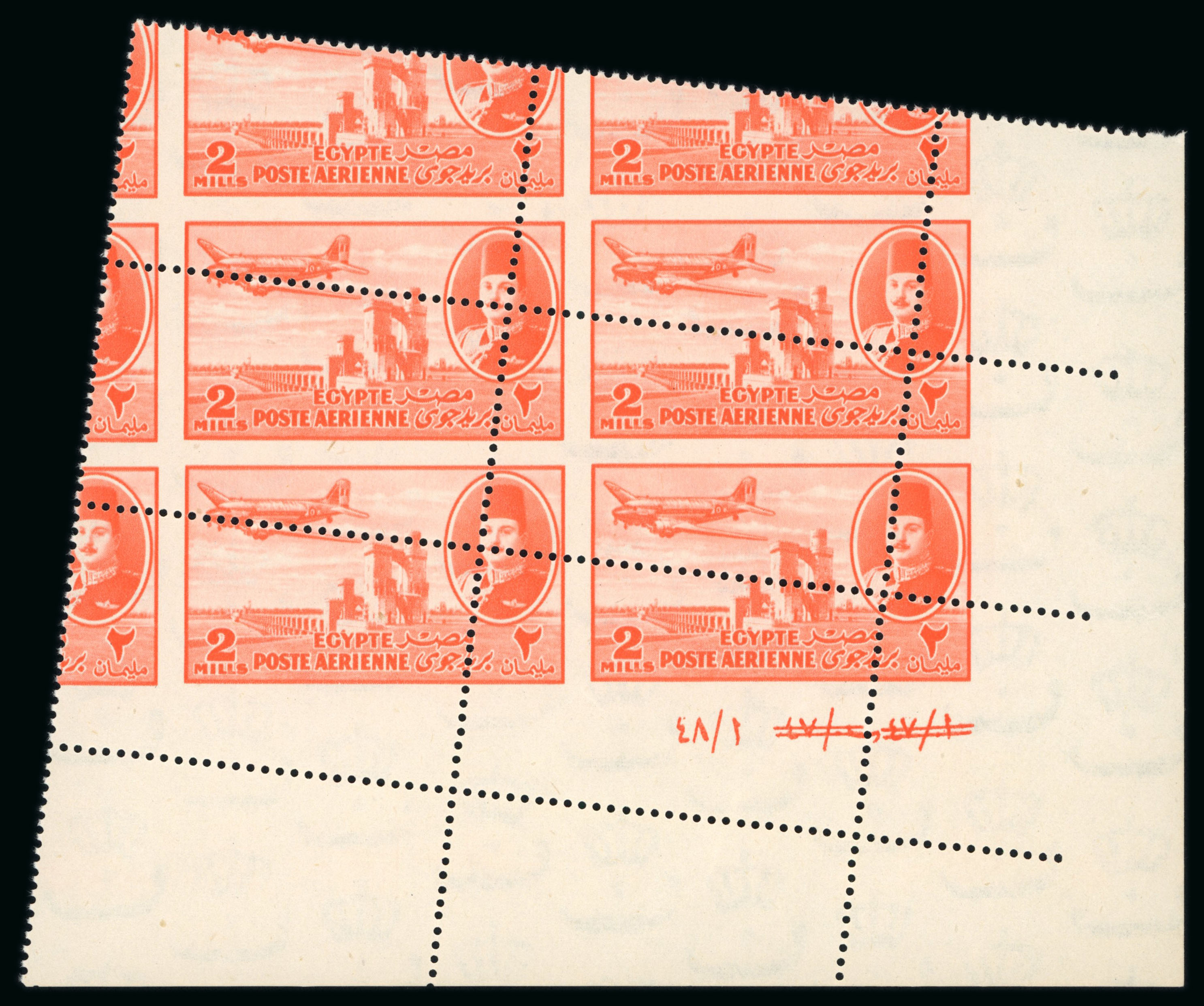 1947 Airmail 2m vermilion, Royal oblique perforations in mint nh bottom right corner sheet marginal plate block of six, numbered in Arabic letters A/48, fresh, very fine and an extremely rare control block, only two such controls are