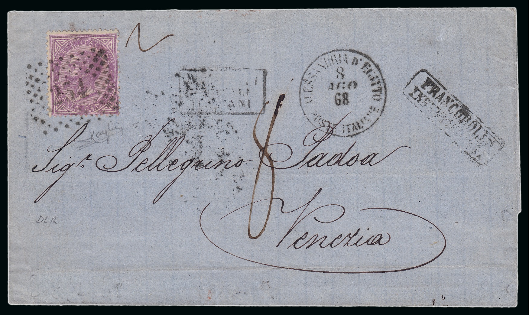 1868 (8.8) Folded cover from Alexandria to Venezia, Italy, franked Italy 1863 60c tied clear “234” numeral, with “ALESSANDRIA D’EGITTO” cds & framed “PIROSCAFI POSTALI ITALIANI” and “FRANCOBOLLO/INSUFFiCIENTE” alongside, fine;
