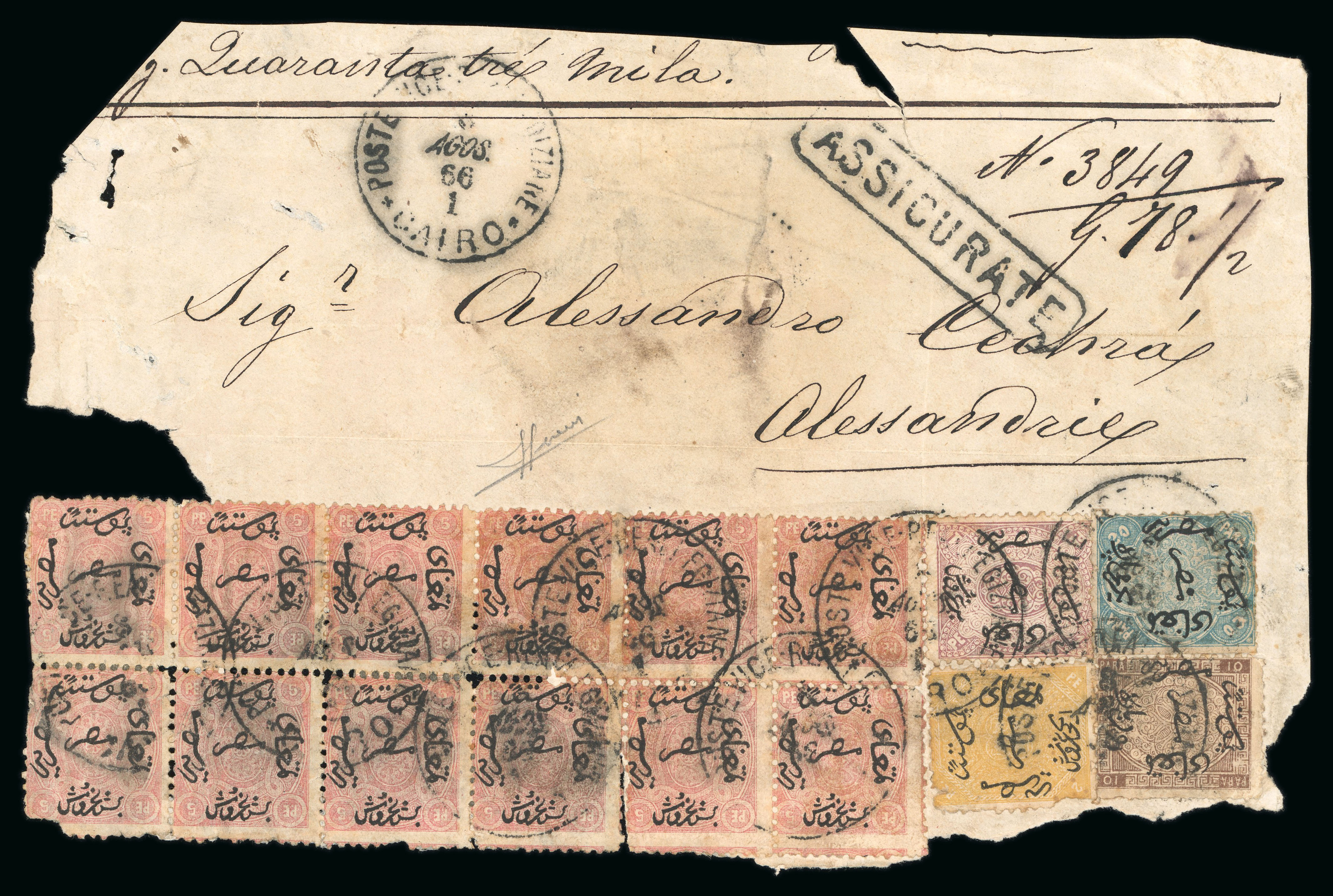5pi Rose, the unique block of twelve in combination with 10pa brown, 20pa blue, 1pi claret and 2pi yellow, perforation 12½, all tied on 1866 (August) large part insured cover front from Cairo to Alexandria, by POSTE VICE-REALI EGIZIANE /