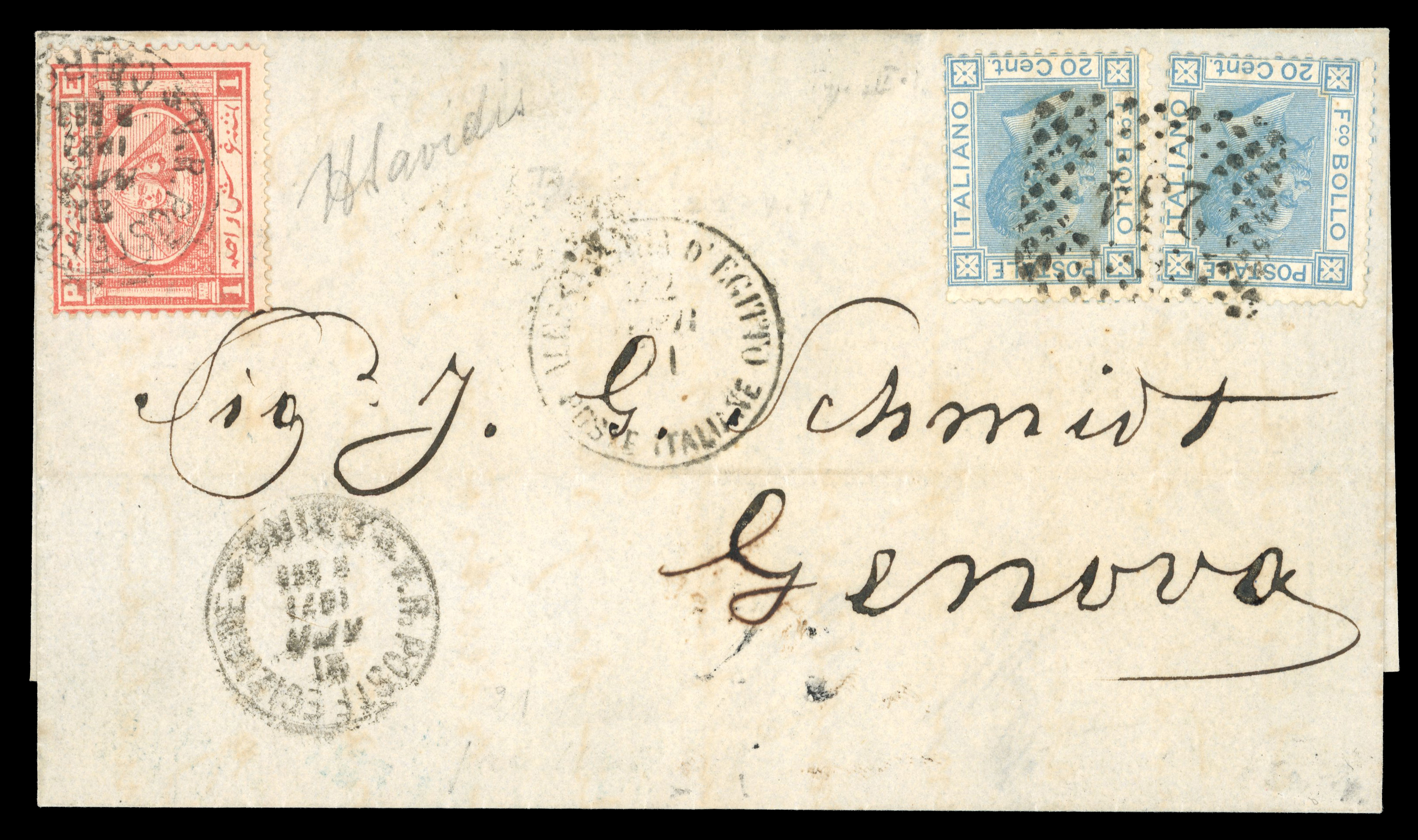 1871 (Apr 21) Combination cover bearing Second Issue 1pi rose-lake tied by POSTE EGIZIANE CAIRO 21 APRIL 71 with two Italy 20c tied by Alexandria "234" numeral, backstamped Genoa, fine, cert. BPA (1977) (Image 1)