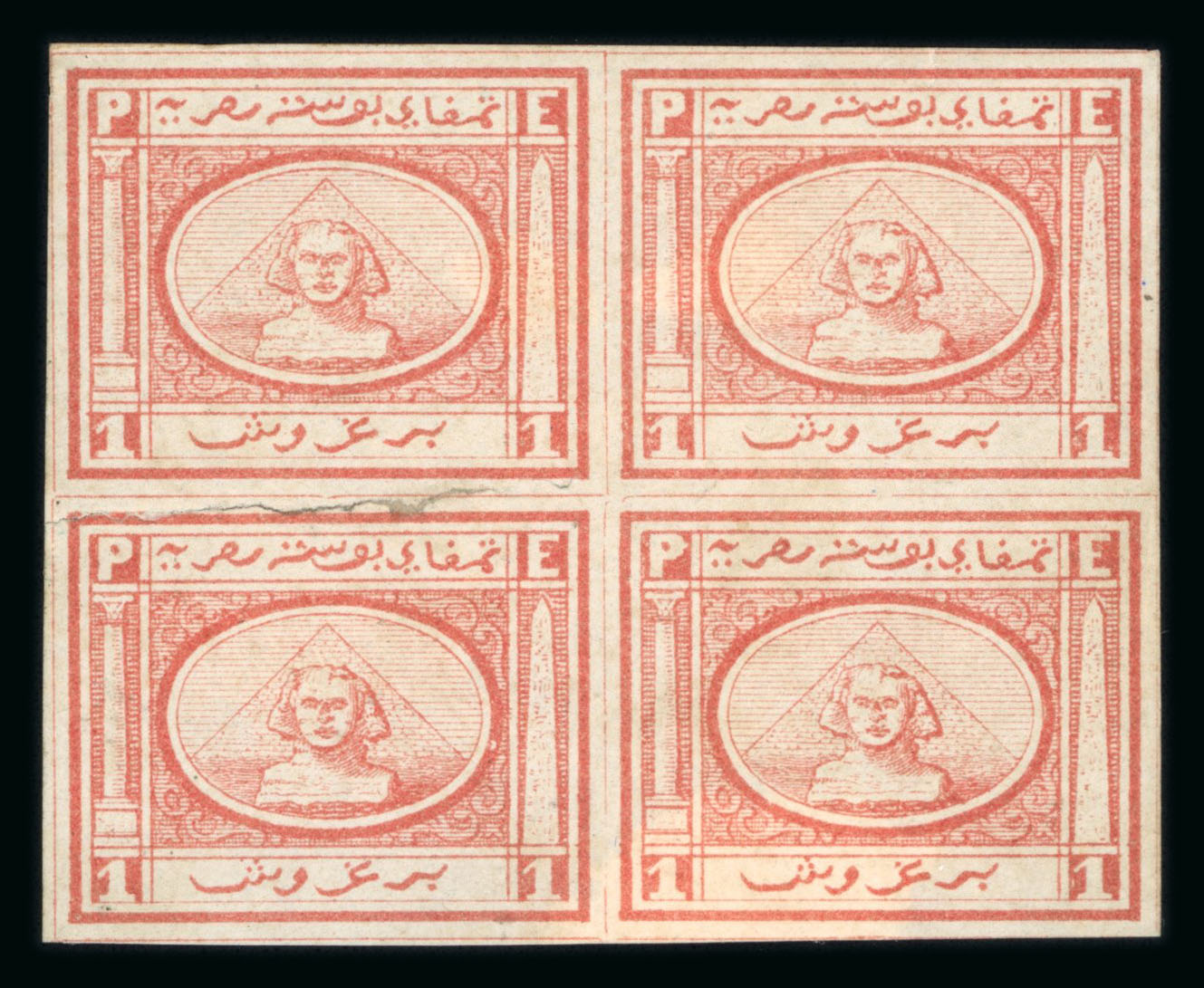 1867 Essay of V.Penasson, Alexandria: Sphinx and Pyramid 1pi rose, imperforate block of four, tear through left pair, very rare, ex. British Royal Collection (Nile Post E26a) (Image 1)