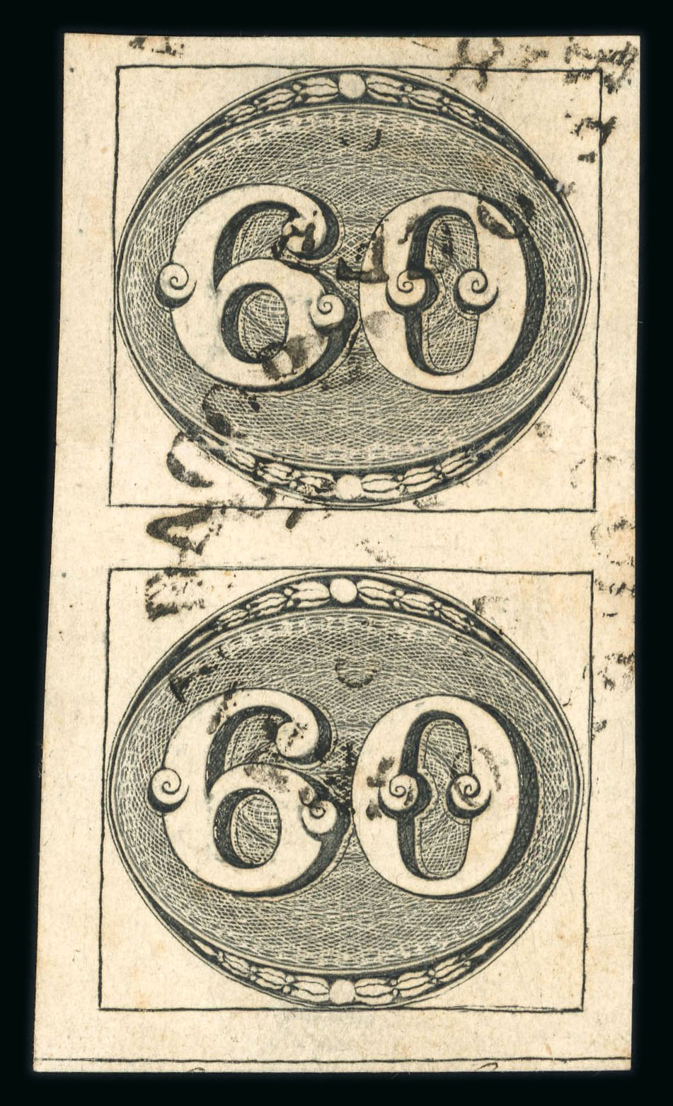 1843 60r. black, early impression showing pre-printing paper fold across the stamp at top, four good to large margins with full dividing line at right, used with part double-ring date stamp, Brutus and Schmidt handstamps on reverse. (Image 1)