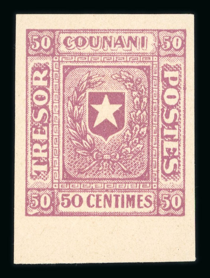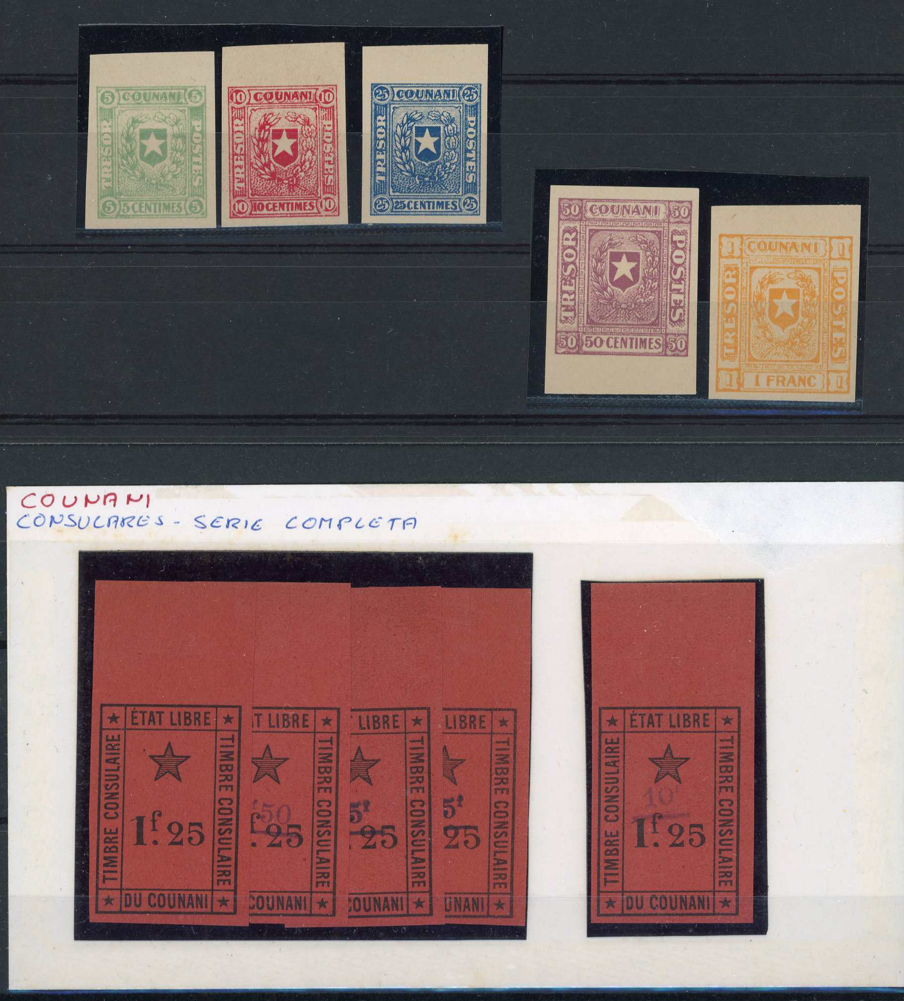 1893 Republic of Counani accumulation of issues from 1893 onwards, all imperf of various sizes and values including a 10c pair with large part violet Postes/ Repu. Du Couna(ni)/ Liberte, also with a France 1886 10c Sage
