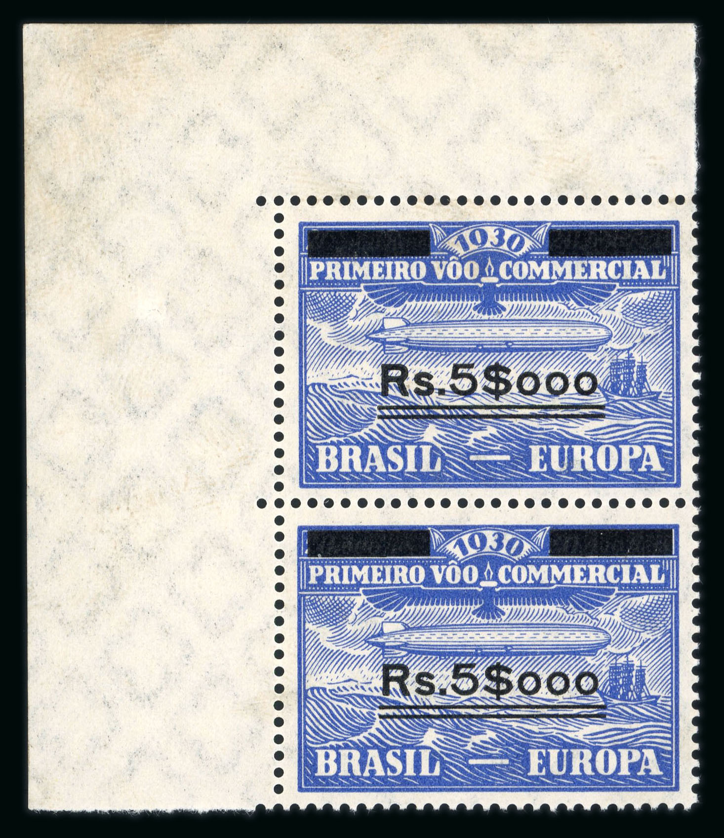 1930 Zeppelin 5000 on 20000 blue mint n.h. pair from the upper left corner, fingerprints in the margin, very fine (Michel €460+ for hinged, Scott $900+). (Image 1)