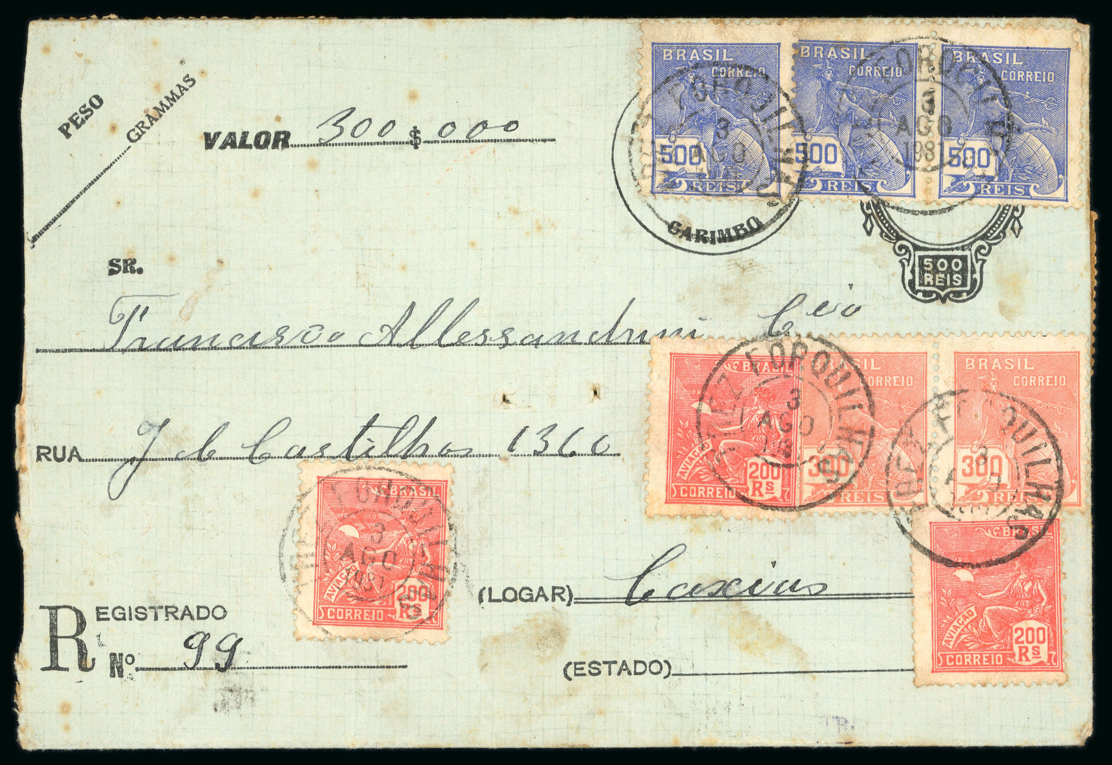 Postal Stationery: Two 1931 500r value declared insured envelopes, one insured for 285, 500r additionally franked twenty 300r Mercury and Globe, the other insured for 300,000r and additionally franked Mercury 300r (2) and 500r (3) plus