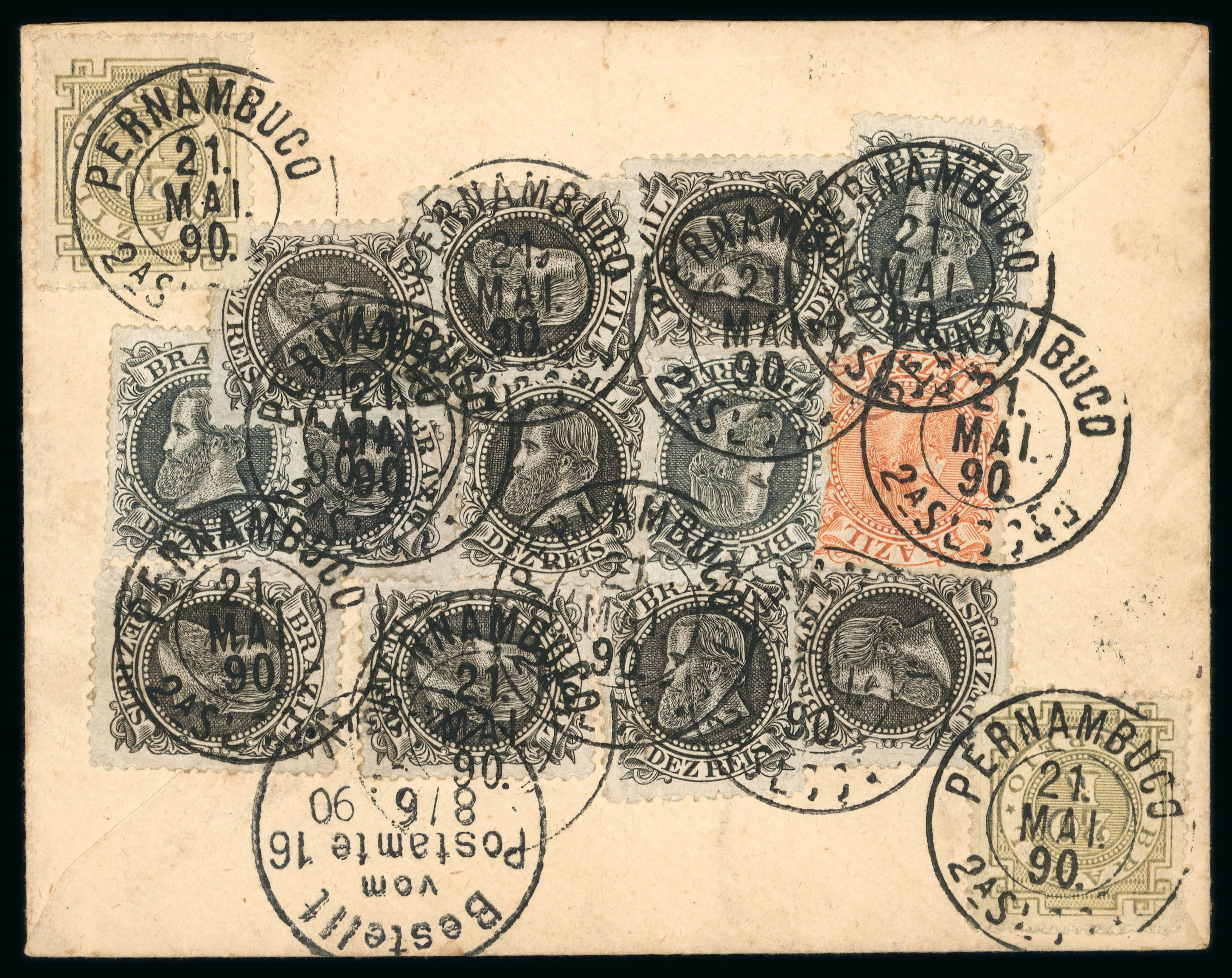 1890 (21 Mai) multi franked envelope to Berli franked front and back with both small and large heads plus two numerals, a spectacular cover. (Image