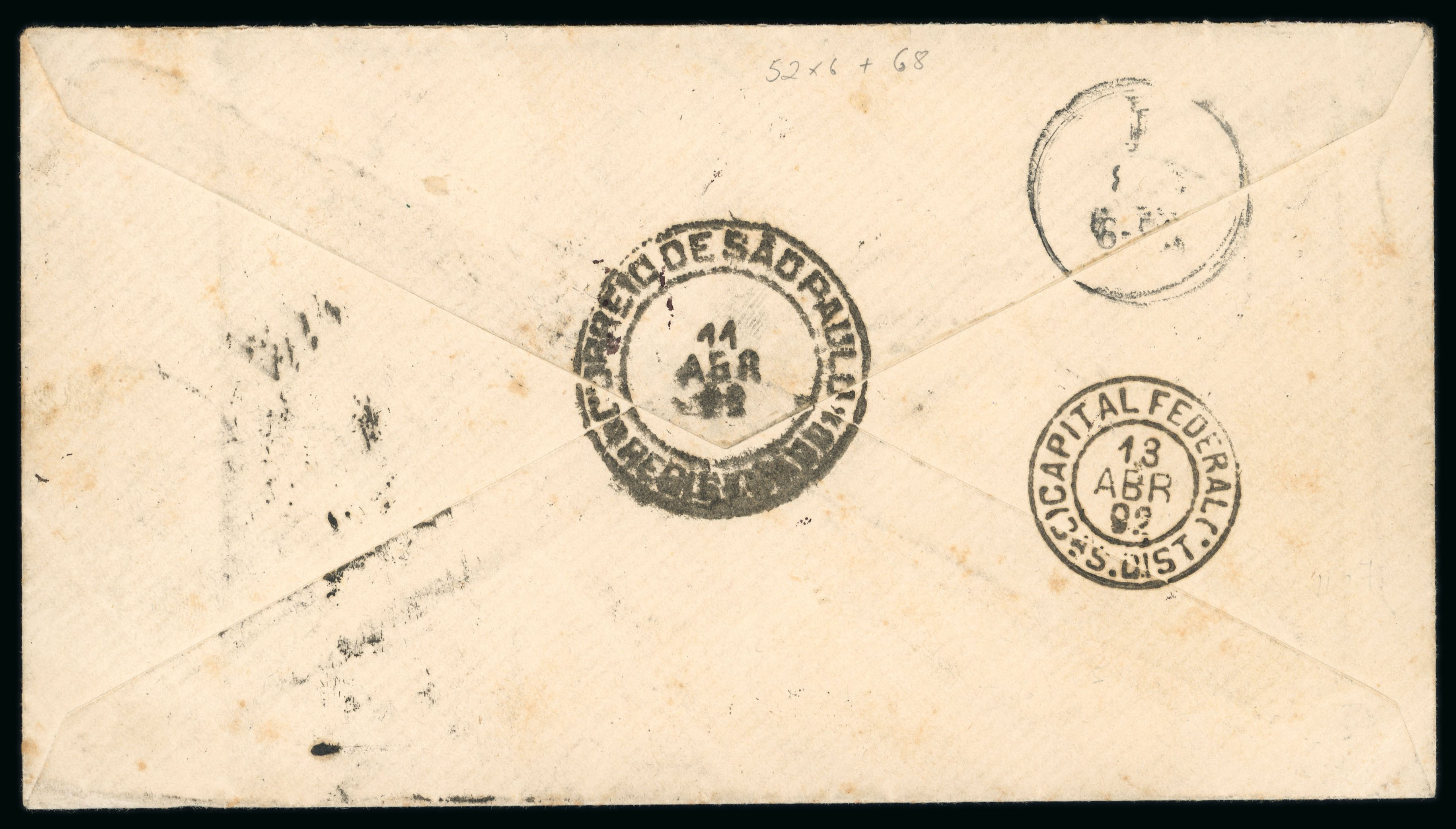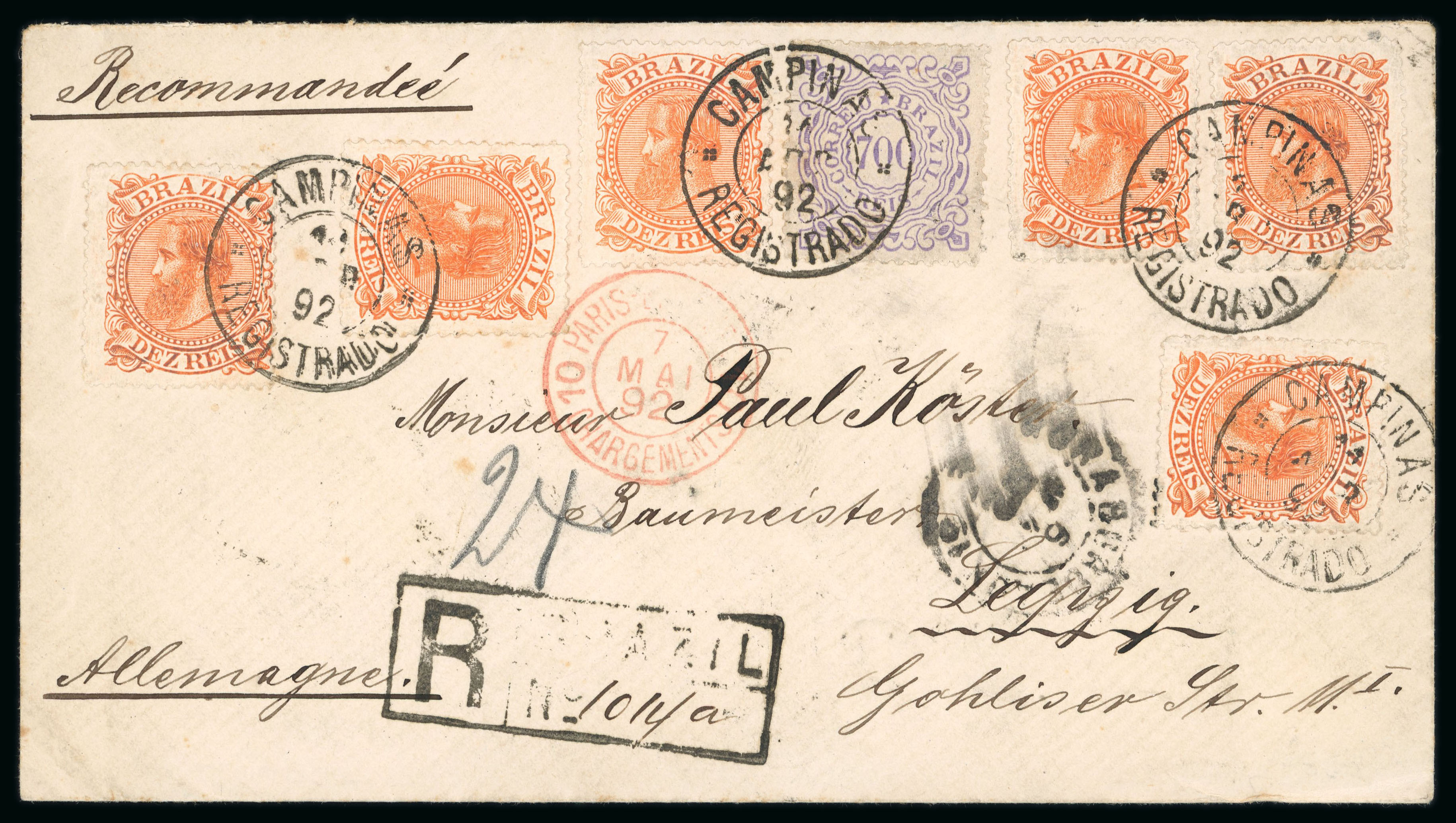 1892 (24 Apr) registered cover to Leipzig franked six 10r orange together with 700r numeral tied Campinas Registrado cds, framed registration handstamp, red Paris central transit, reverse with large Sao Paulo registration date stamp,