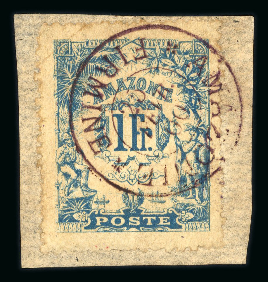 1900 Amazonie Firmine group of four values 5c., 10c., 1f. and 5f. each tied to small piece with double-ring Amazonie Firmine date stamps, a couple of slight faults. (Image 1)