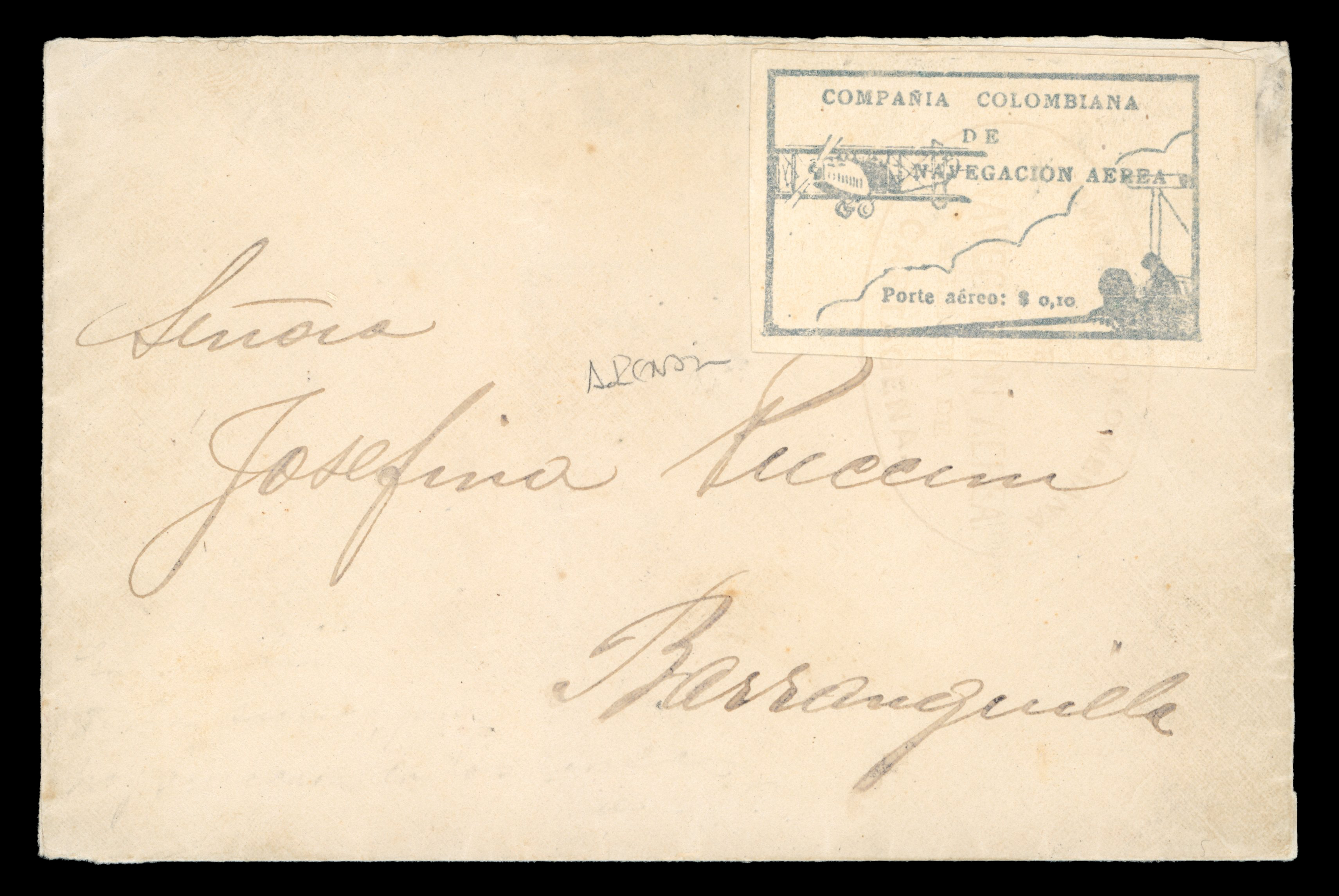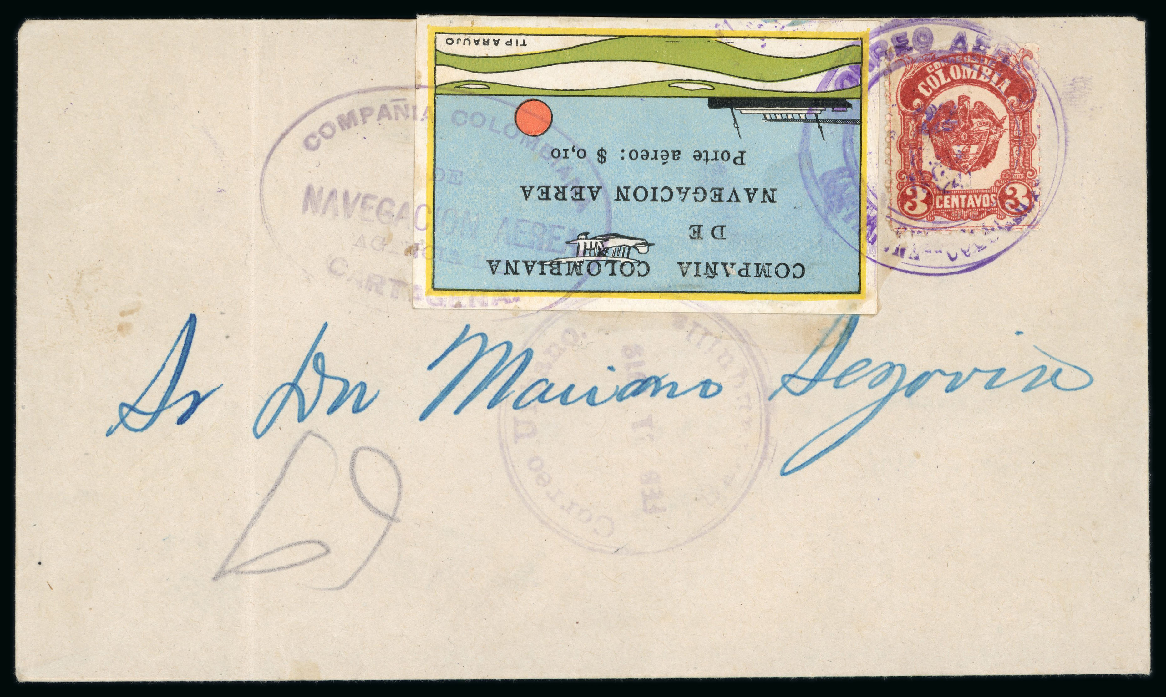postage including two 3c applied on front, tied by "Correo Aéreo./Cartagena-Colombia." cds. A most significant and desirable item, representing the only cover known from this flight. Cert. Enzo Diena (1988). Ex Toro Pinzón. (Image 1)