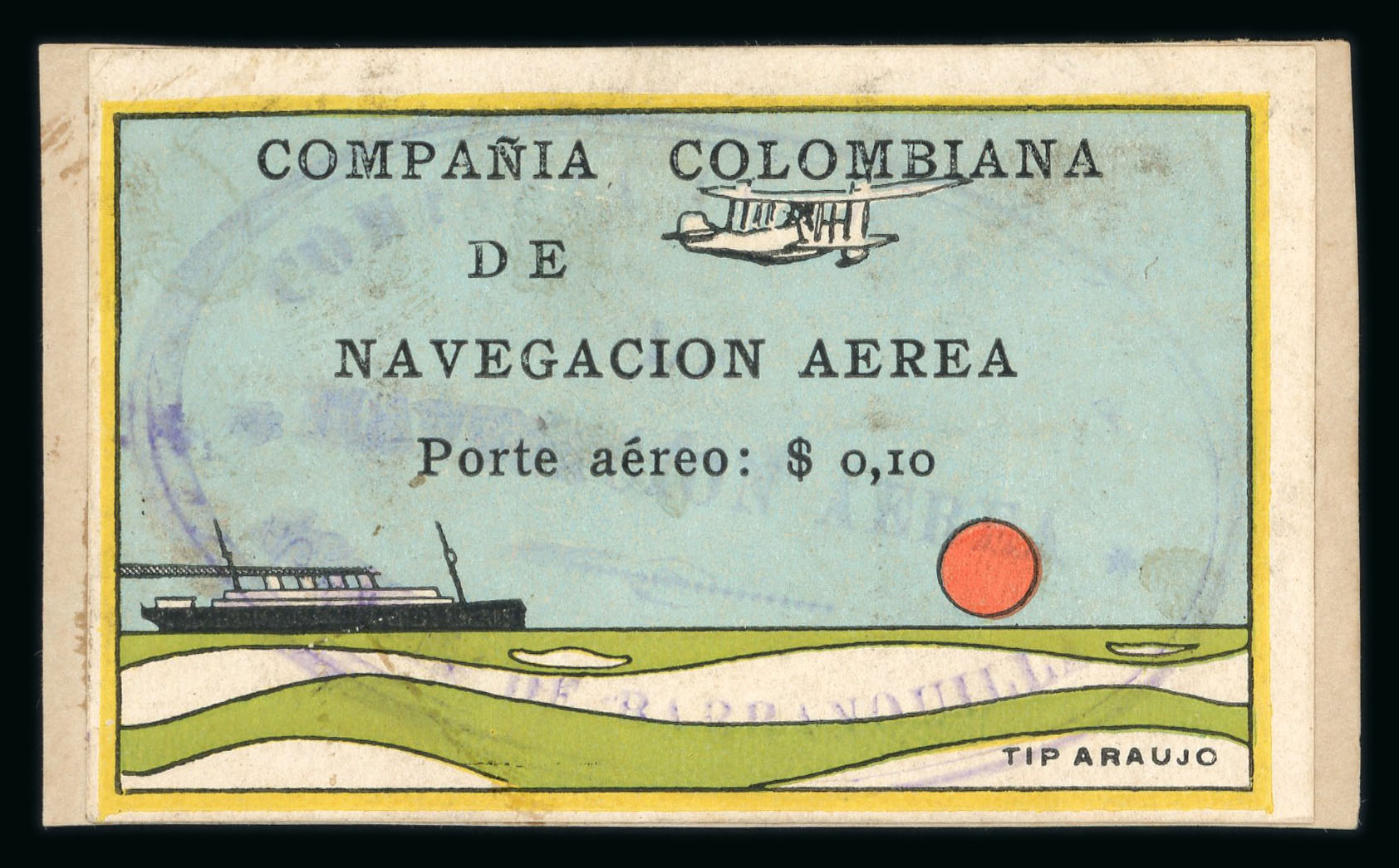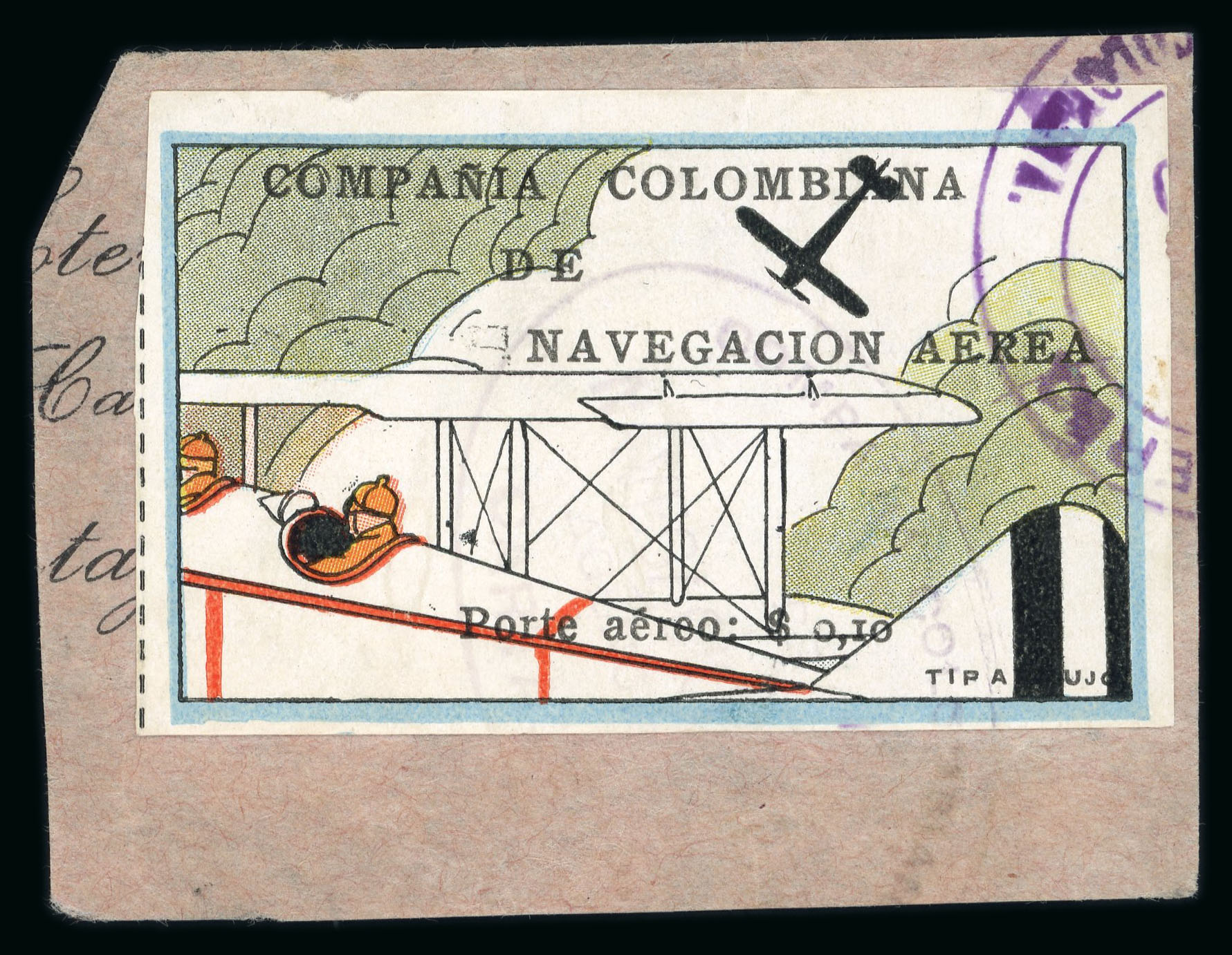 1920 Compaña Colombiana de Navegacion Area (CCNA) 10c "fuselage and tail of biplane", large margins all around and lightly tied to small piece by violet CCNA oval cachet and airmail cds, very rare especially in this outstanding condition,