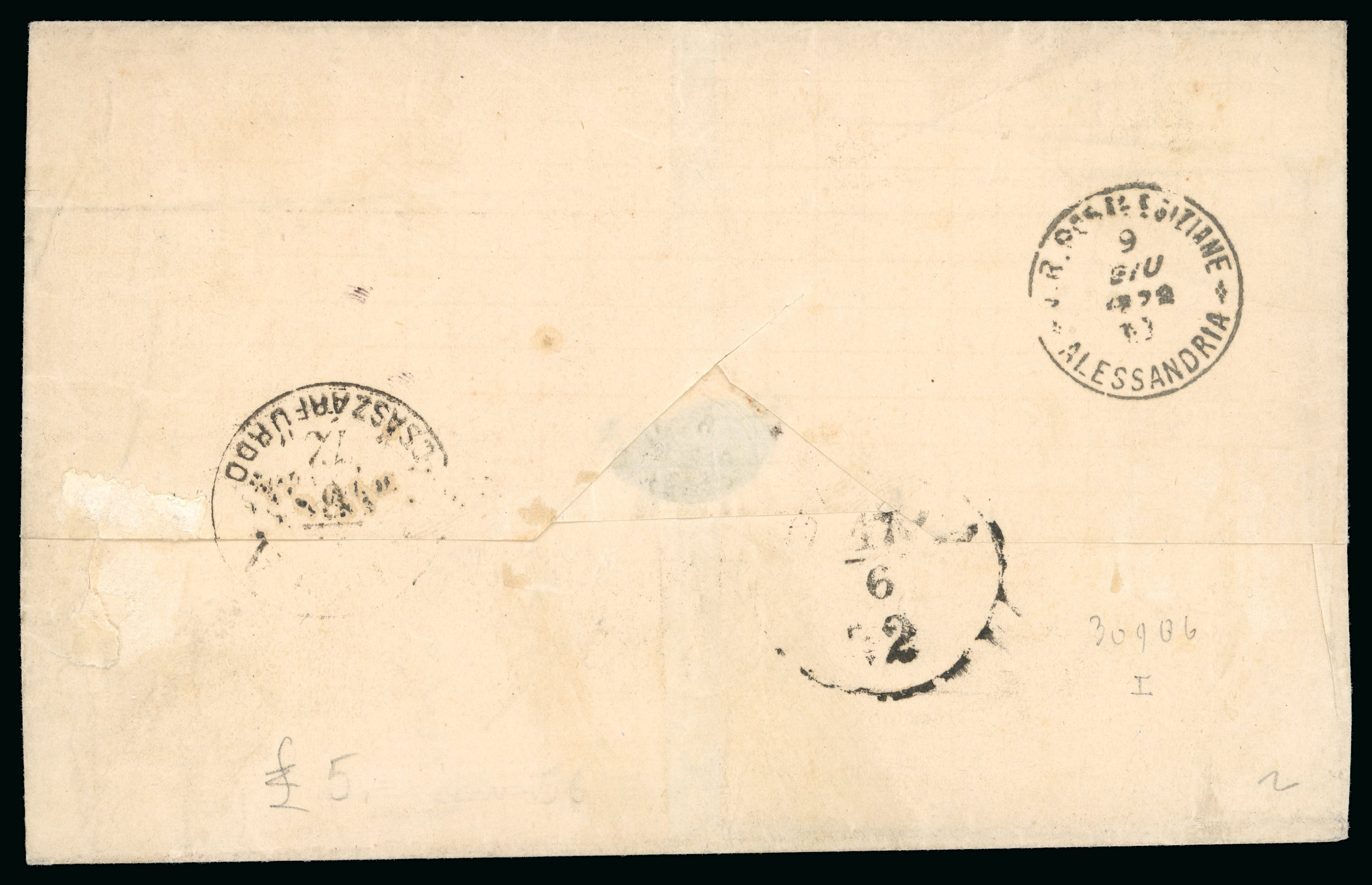 2 1/2pi violet, tied on folded cover from Cairo via Alexandria & Trieste, to Olen (Hungary), by V.R. POSTE EGIZIANE/CAIRO/9.GIU.1872 cds, with italic FRANCA straight line alongside, transit bs, a fine and scarce single franking. (Image 1)