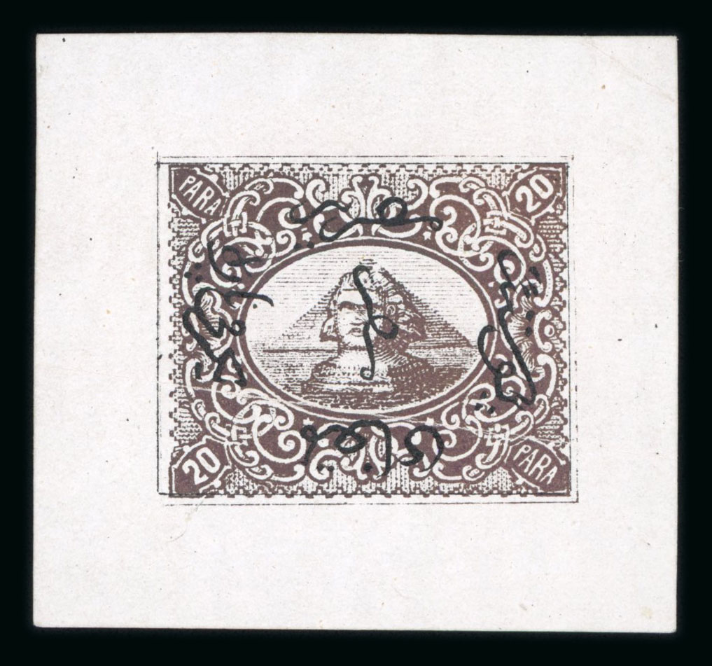 1869 Essay by Renard, Paris: Sphinx and Pyramid 20pa brown with overprint in black imperforated on white glazed paper, creased, very fine and scarce (Nile Post E44) (Image 1)