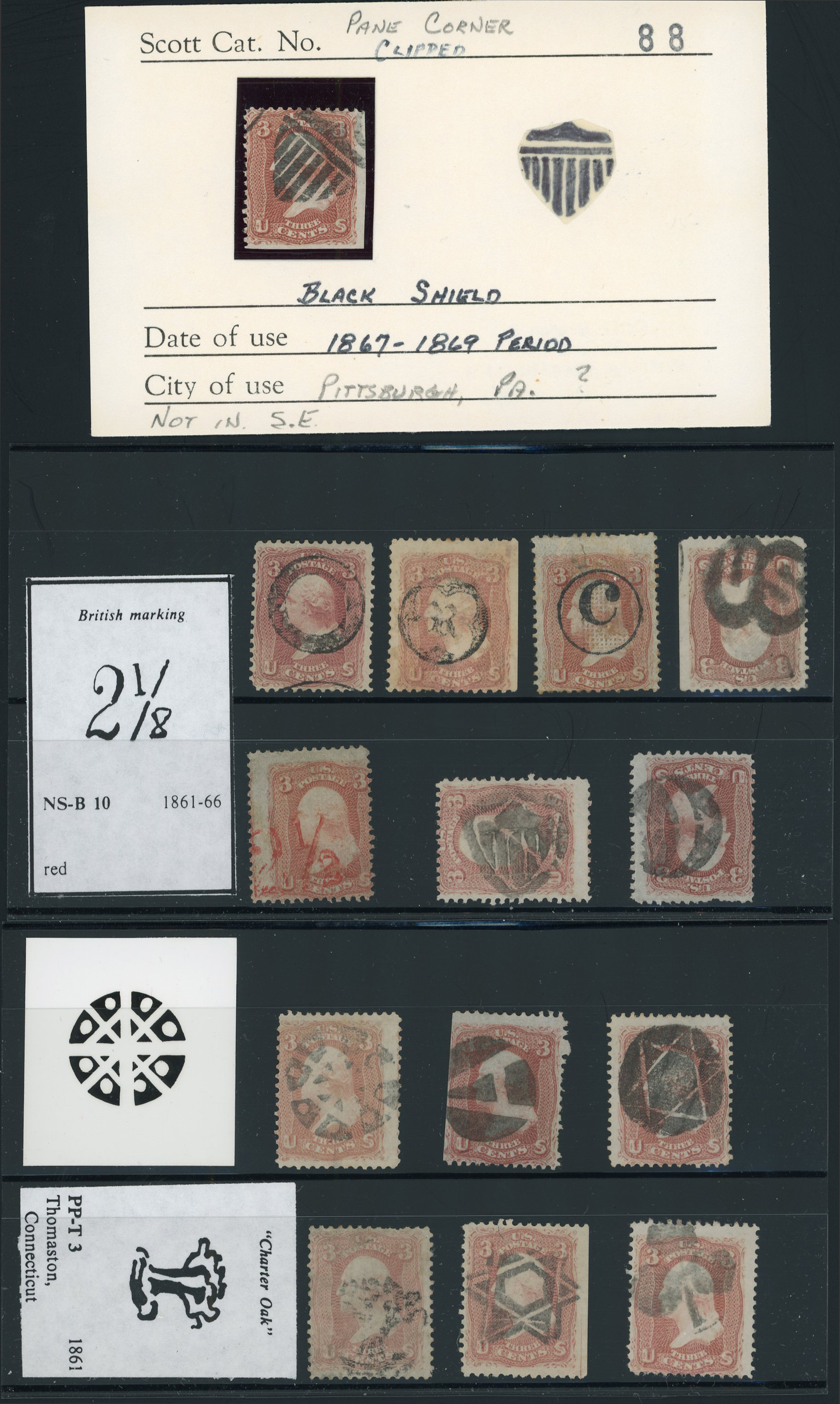 1861-62 3c Washington group used with fancy cancels including blue Philadelphia Moon, Stillwater MN circle of small circles, framed OK, Charter Oak of Thomaston; fair to fine condition (25 stamps, one cover) (Image 1)