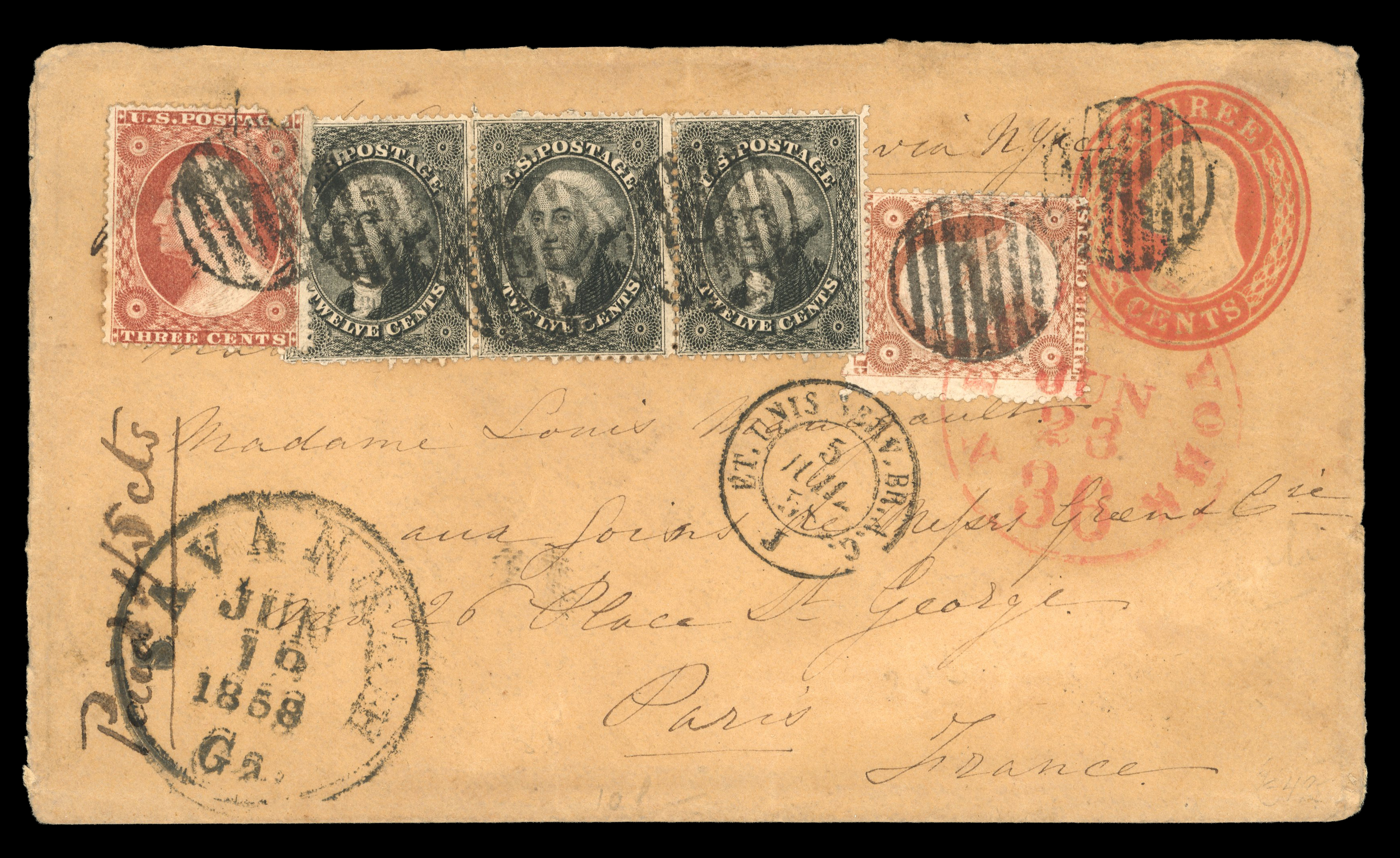 1858 (Jun 19) 3c postal stationery envelope to Paris, France additionally franked two 3c. (one damaged) and horizontal strip of three 12c. tied by neat grid cancels, routed via New York; envelope opened out for display (Image 1)