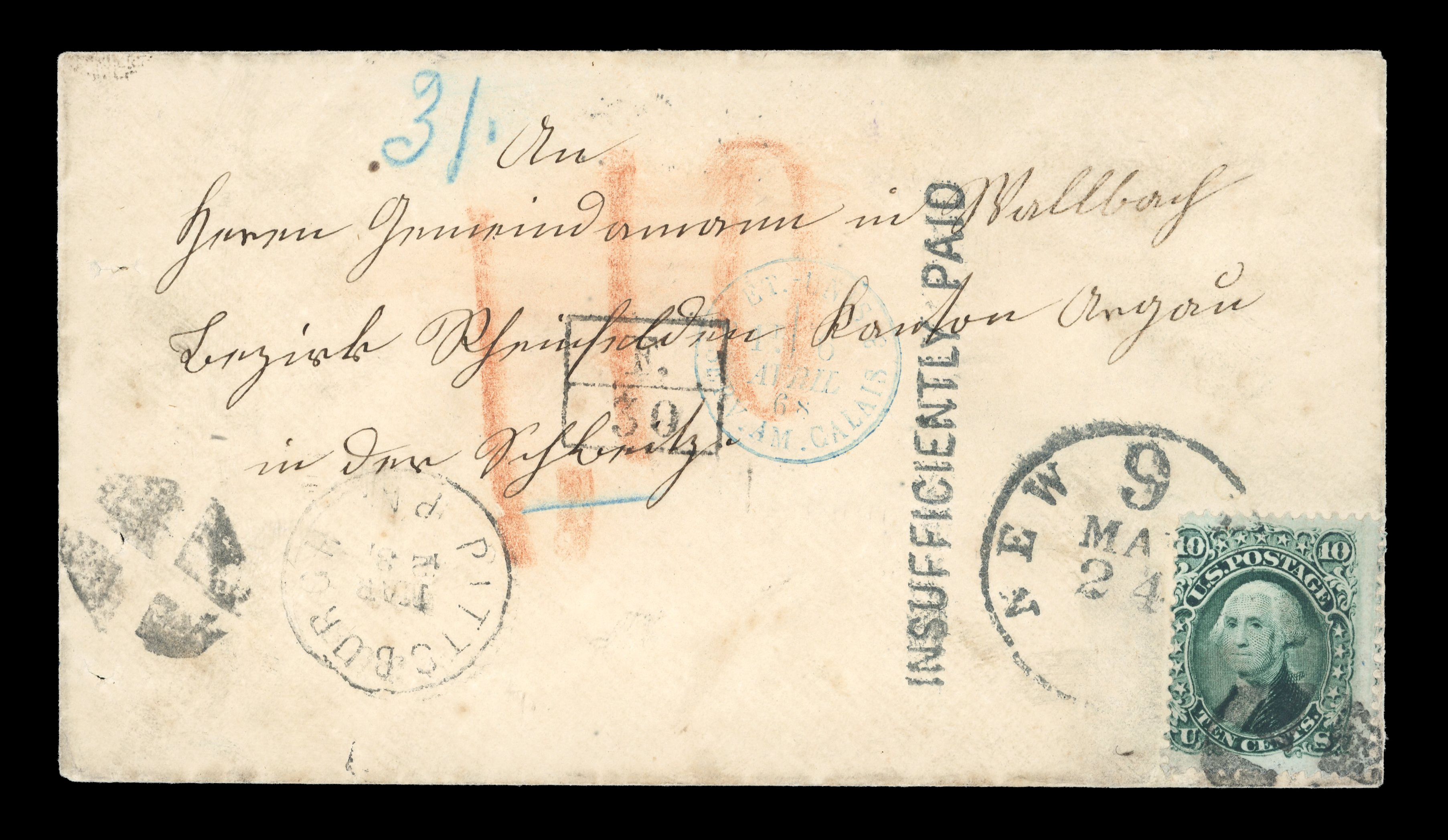 1868 cover to Switzerland underfranked with only single 10c. with segmented cork handstamp, repeated at far left with Pittsburg cds alongside, New 9 York date stamp, straight-line INSUFFICIENTLY PAID handstamp, framed 'F/30' accountancy,