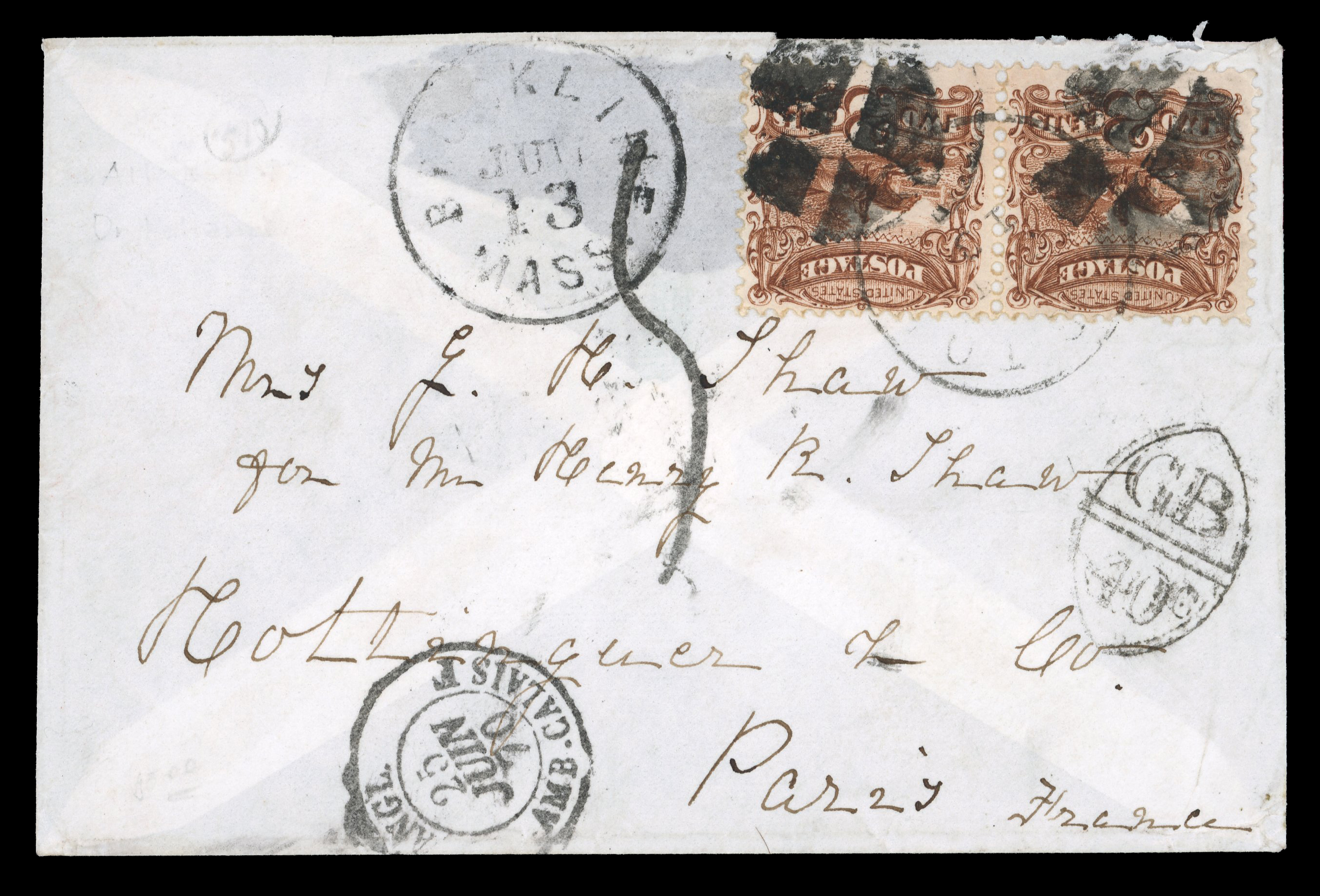1870 cover to Paris franked pair 2c., each with bold segmented cork handstamps, Brookline Mass cds alongside, reverse with red London transit, obverse with French entry and GB/40c accountancy handstamp; good condition (Image 1)