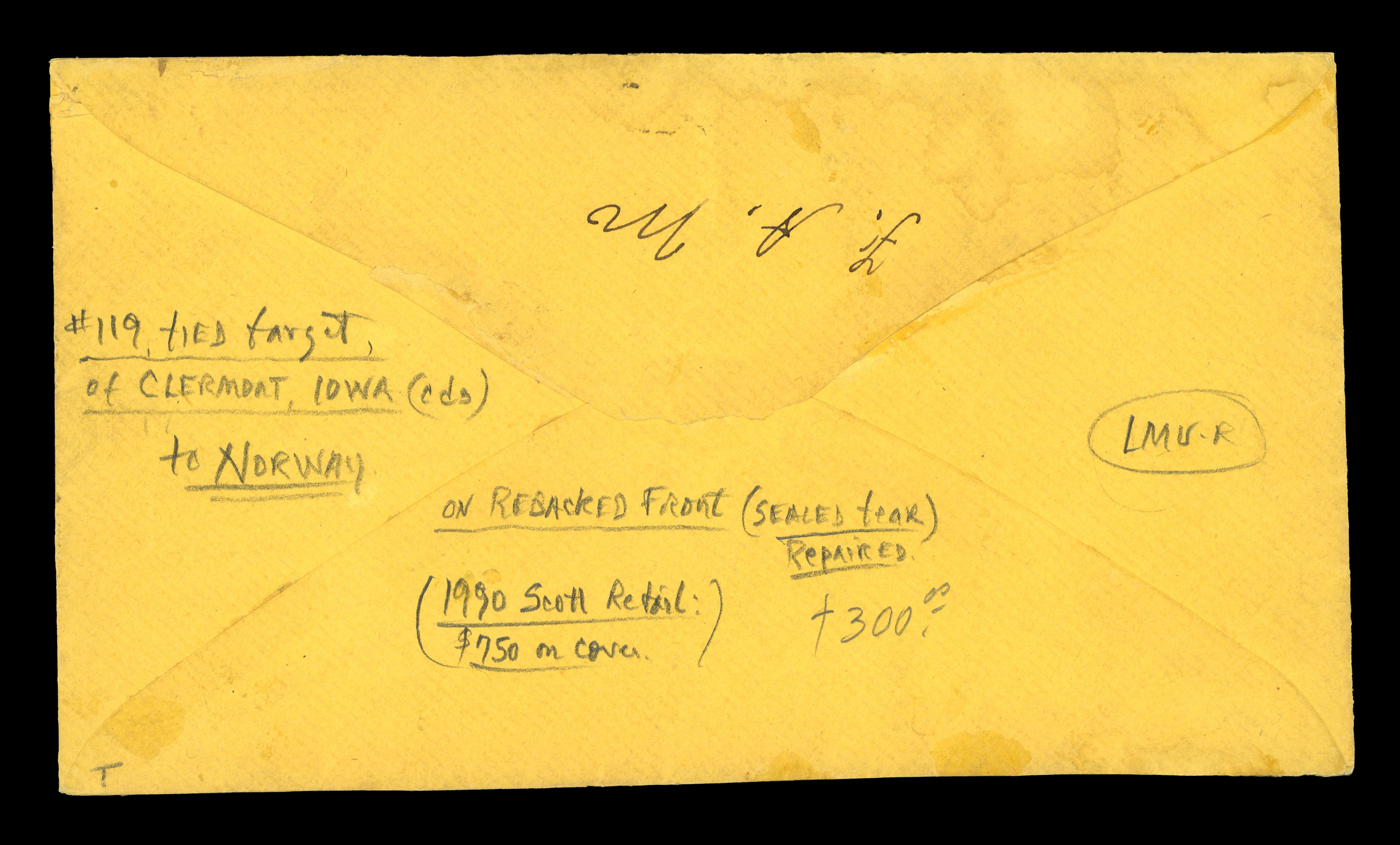 1870 (Nov 17) cover to Norway bearing single franking 15c Columbus, type II tied four-ring handstamp, Clermont despatch cds at bottom left, red New York transit, red 'Wfr 2' accountancy handstamp and Christiania arrival, repair to