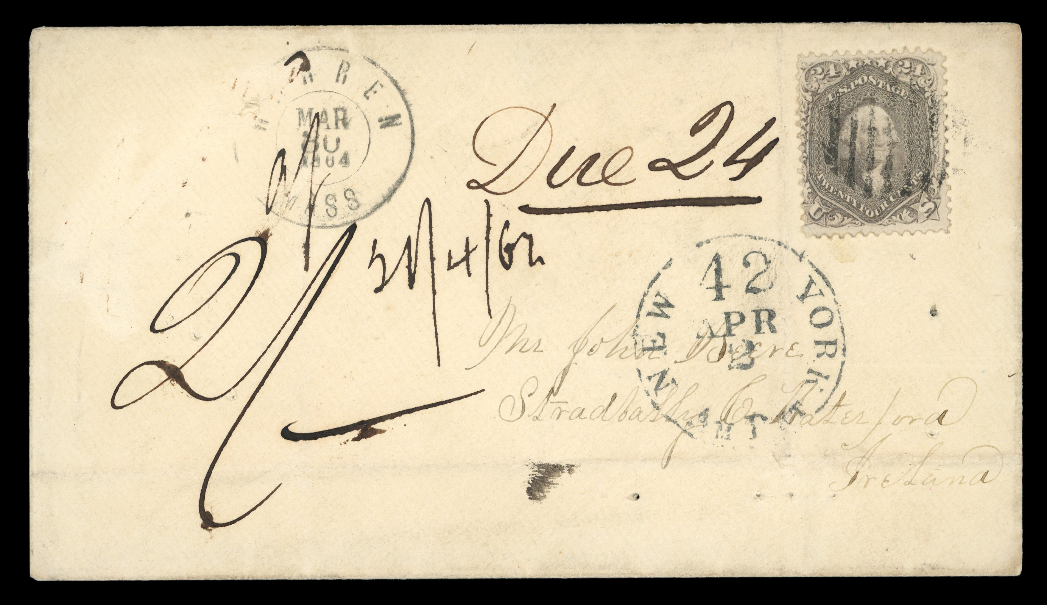 1864 (Mar 30) envelope to Stradbally, Ireland franked 24c. with bar cancel and cds at left but was overweight and the value of the stamp ignored and the New York Exchange Office applied a 42 cents handstamp (Apr 2), Piltown arrival