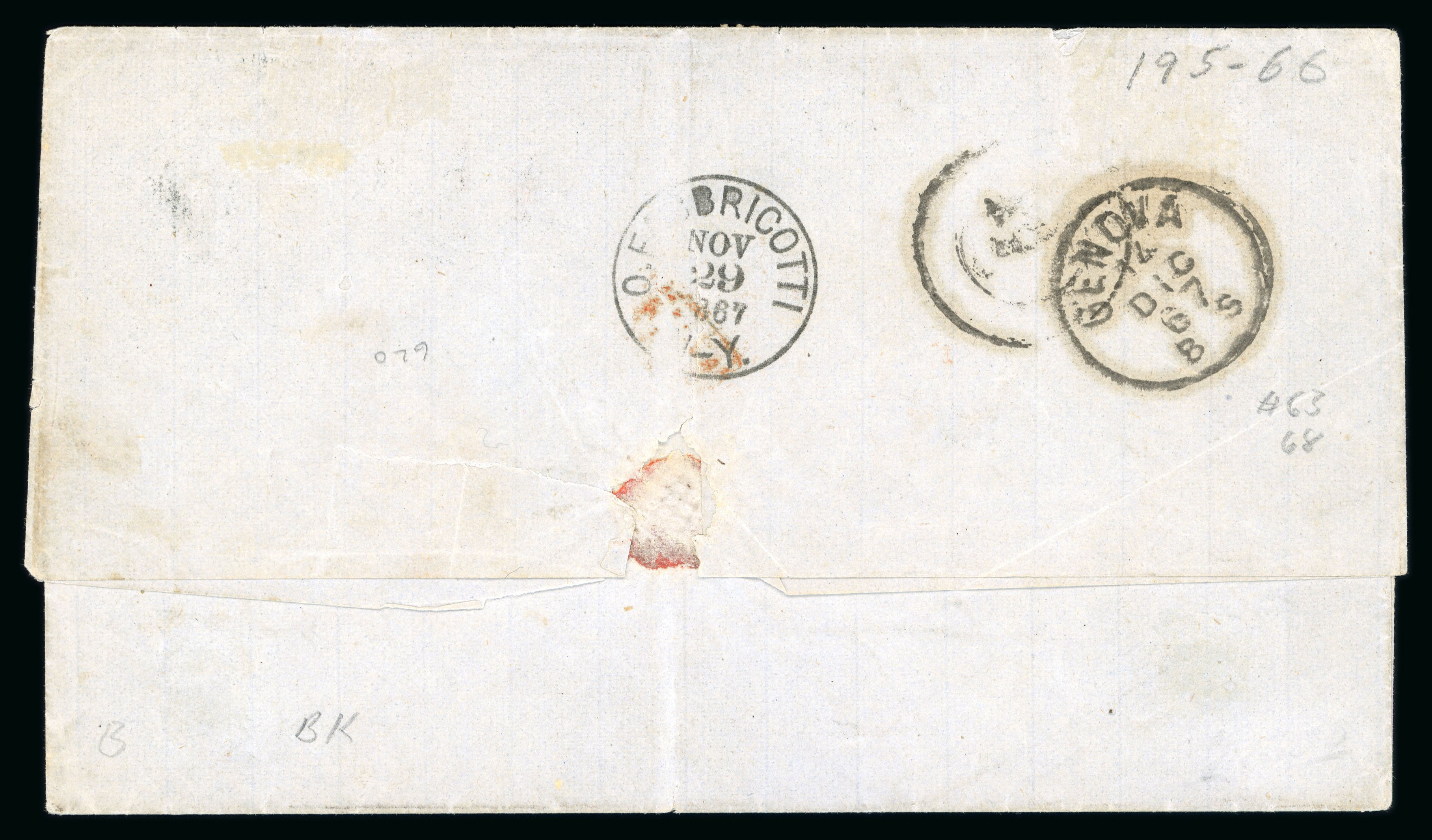 hs at lower right, red framed "HAMBURG/FRANCO" ds after arriving with the HAPAG "Alemannia" and charged with 25 centesimi in ms on arrival, Verona and Rome bs, fine; and 1867 (Nov 30) cover from New York to Genoa, paying the single rate with 1861-62