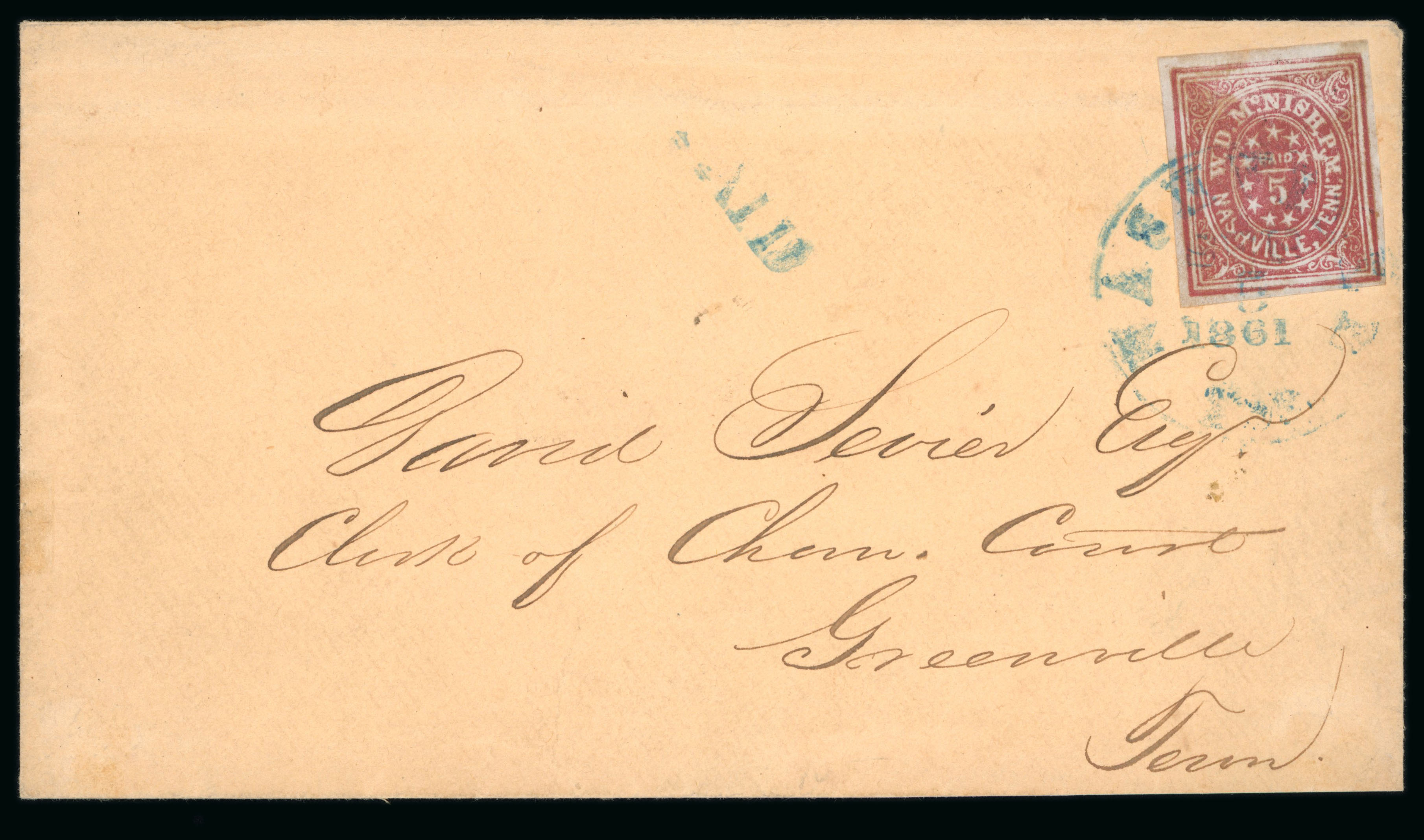 Confederacy Knoxville Tenn. undated envelope to Athens, Tenn. bearing single franking 5c brick-red tied by pen cross, the stamp with three good margins but damaged at right, unclear signature bottom right (Image 1)