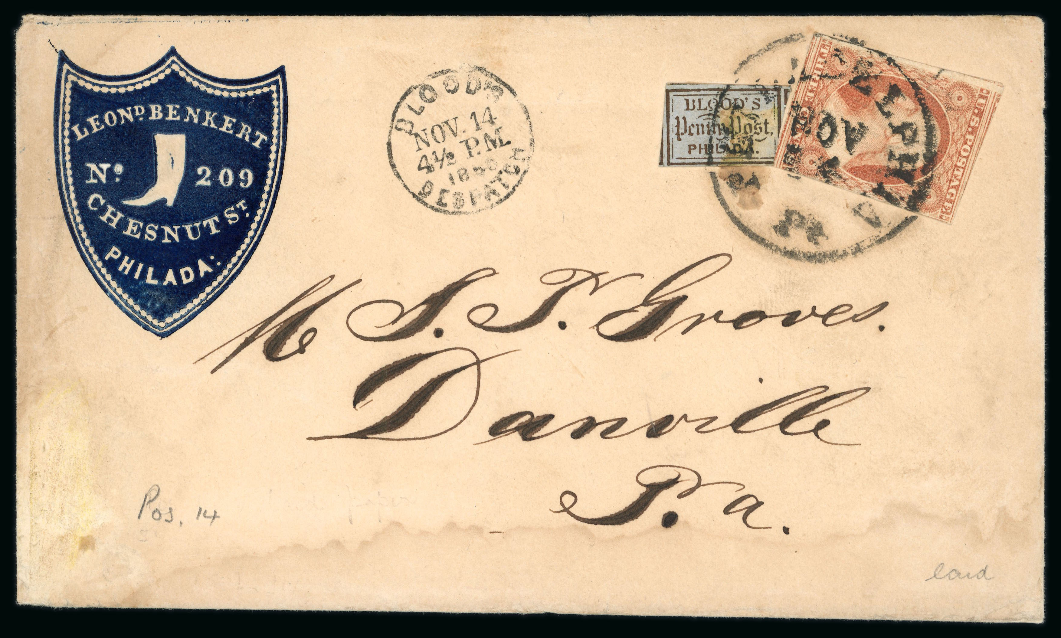 1848-63, group of 13 covers with local post, patriotic covers and Confederate States, incl. Blood’s Penny Post 1c bronze on lilac on small envelope with Blood’s Despatch cds sent to Lancaster in combination with 3c tied by