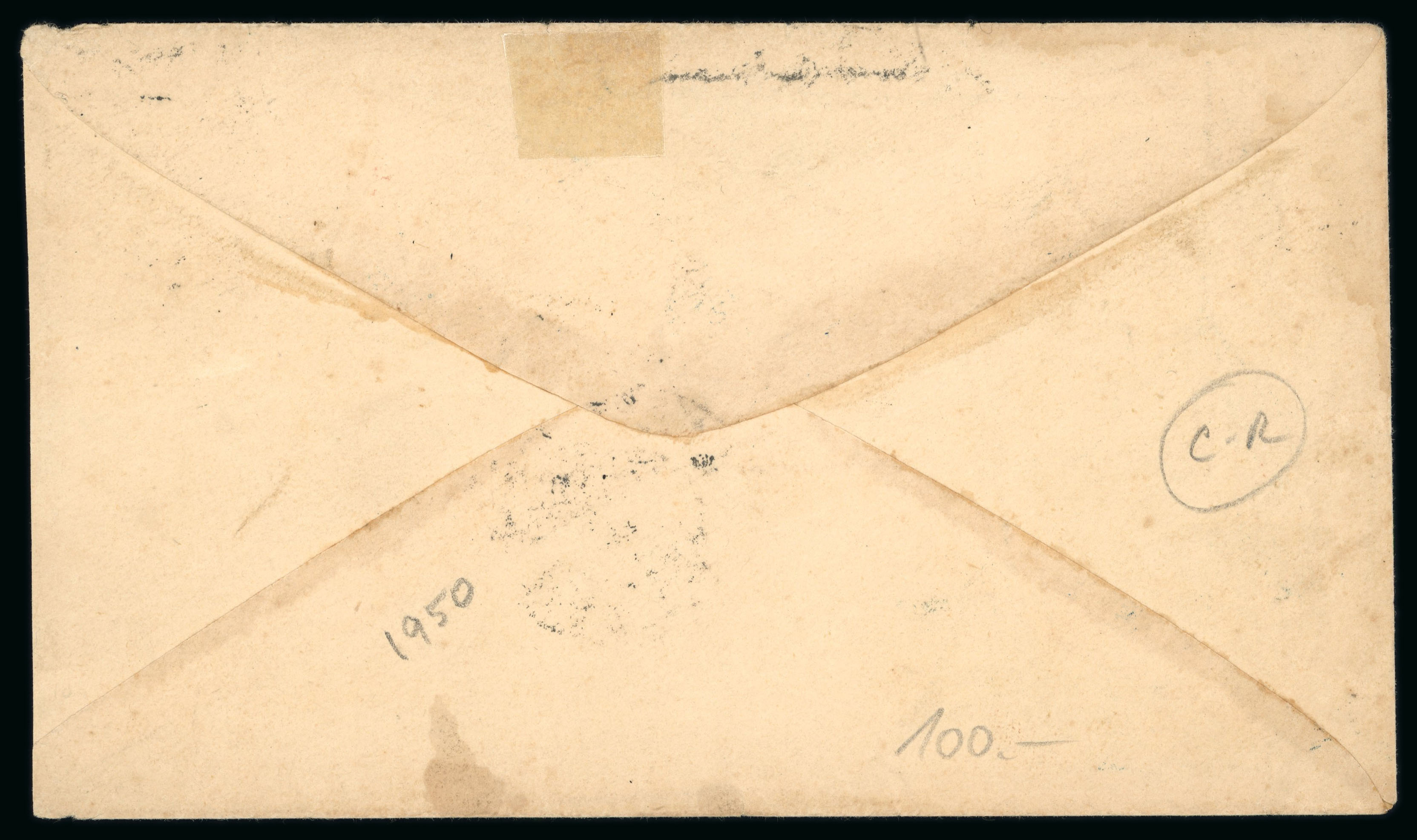 Confederacy 1861 (June 8) stampless envelope to Montgomery, Ala with Mobile Ala cds and small framed PAID/5 handstamp, envelope with repaired backflap and stregthened tear at top left. (Image 1)