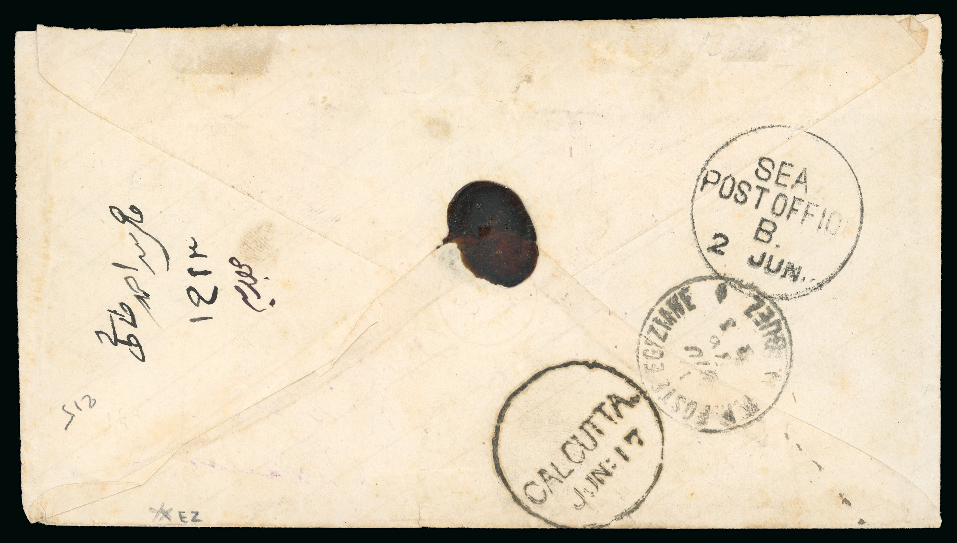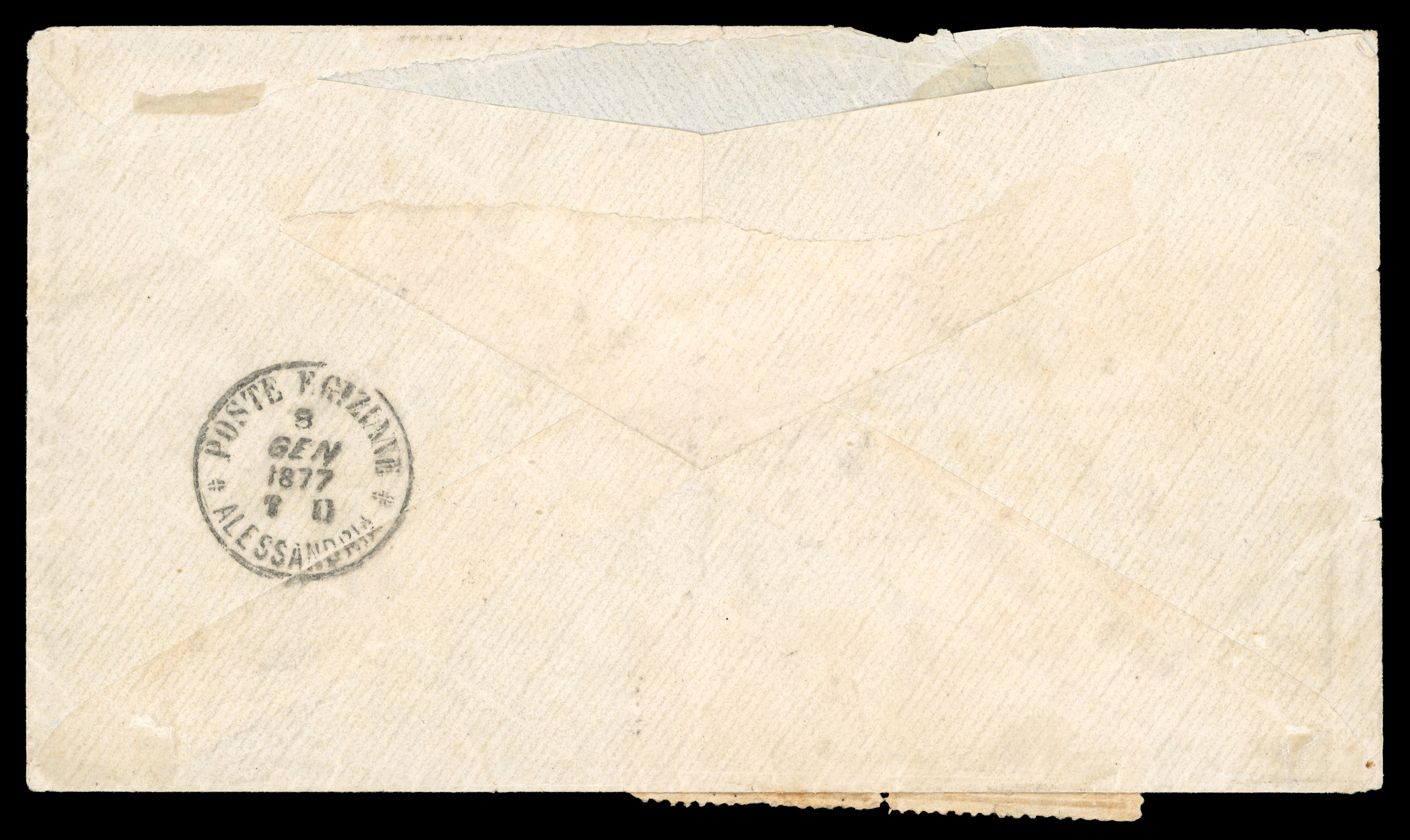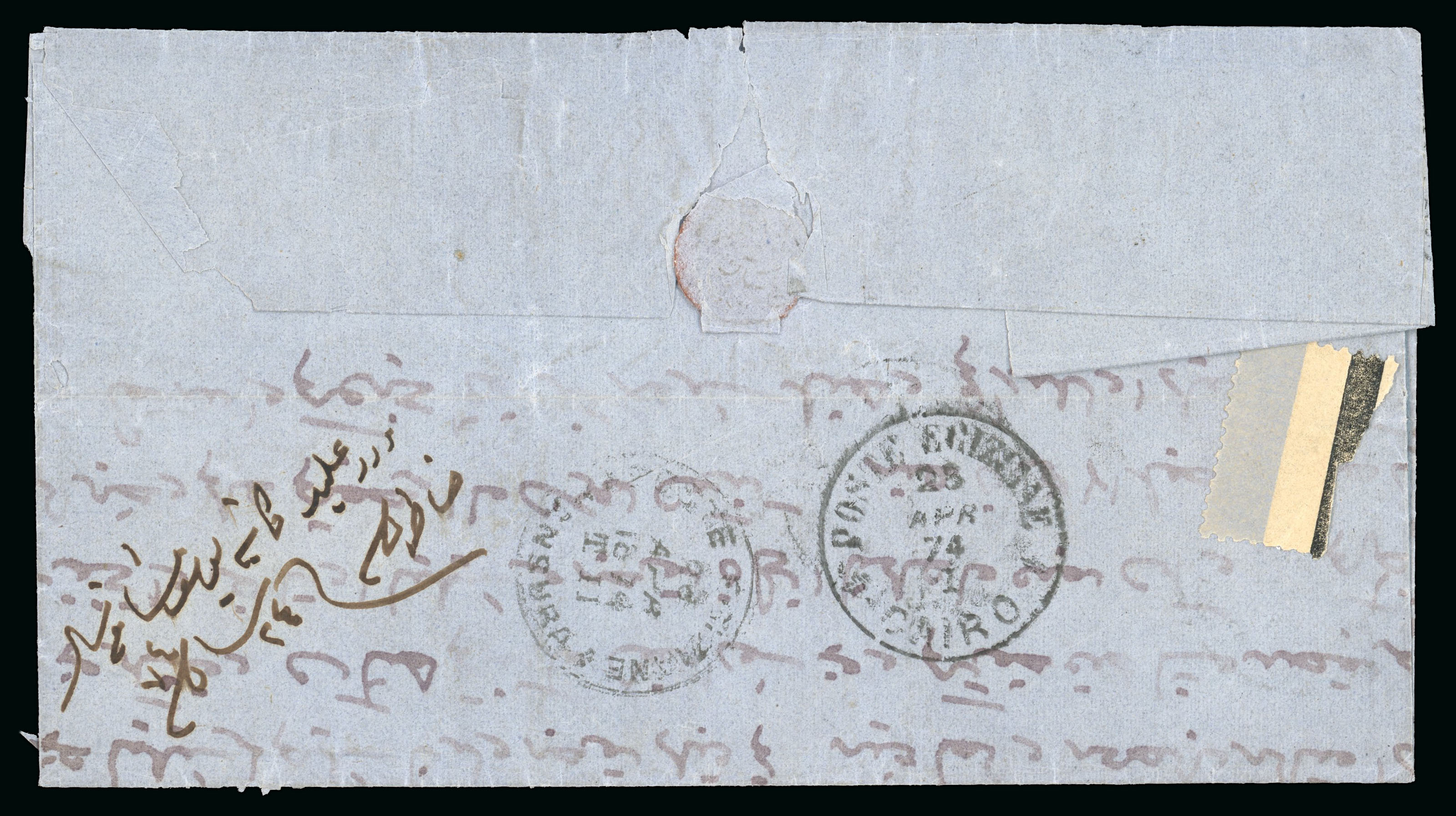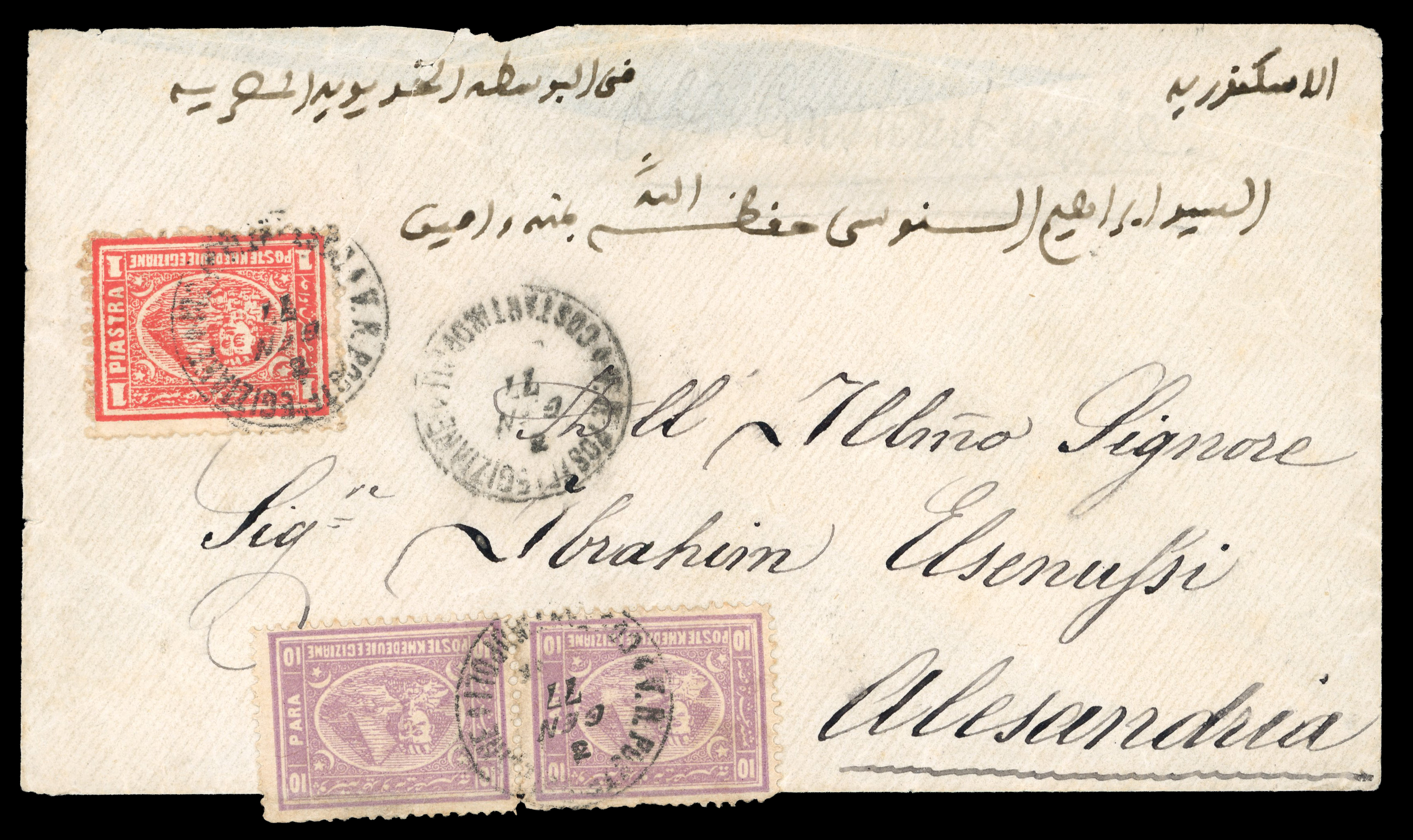 1pi red and a pair of 1872 1st printing 10pa mauve perf.13 1/3, all on 1877 cover from Constantinople to Ibrahim El Senussi, exiled Sheikh of Libya, tied or cancelled by V.R. POSTE EGIZIANE CONSTANTINOPOLI 3 GEN 77, missing portion of