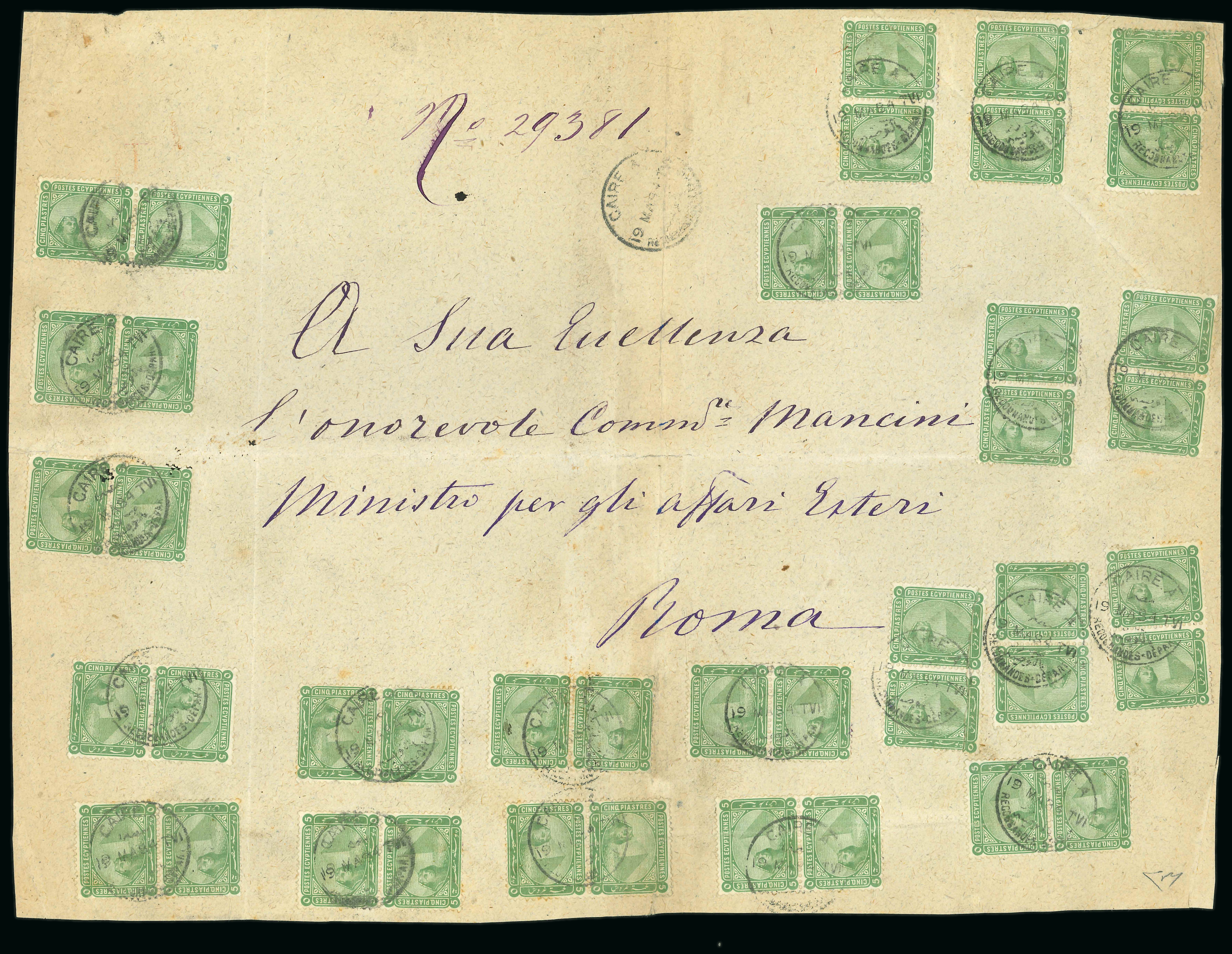 5pi green, an outstanding franking of twenty-one (21) mostly vertical pairs, tied bilingual CAIRE A/RECOMMANDÉS DÉPART/19.MA.84 cds on large registered cover front to the Italian Ministry of Foreign Affairs; Pasquale Stanislas Mancini in