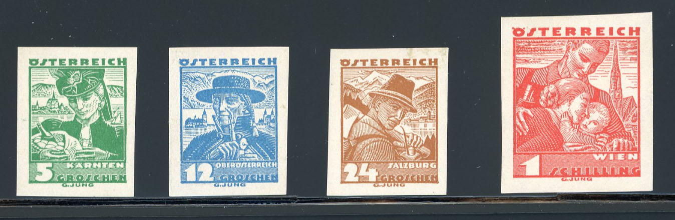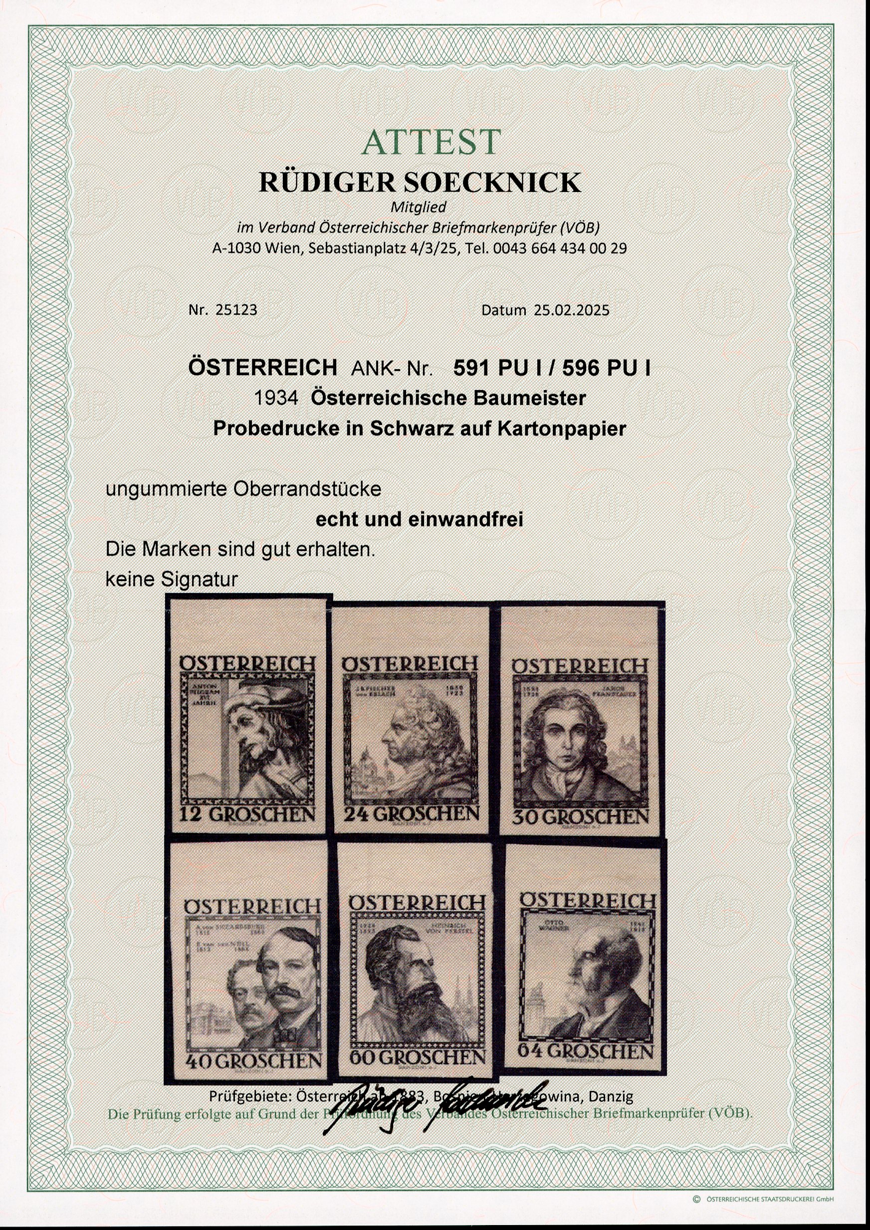 1934, Baumeister kompletter Schwarzdrucksatz UNGEZÄHNT vom Bogenrand auf Kartonpapier, wie immer ungummiert, Prachterhaltung, Attest Wallner und Soecknick, ANK u. Mi 591 PU I - 596 PU I, ANK € 1000. (Image 1)