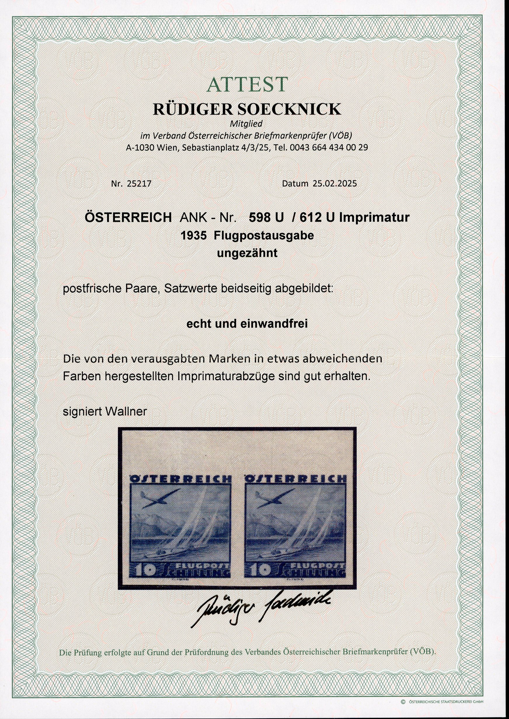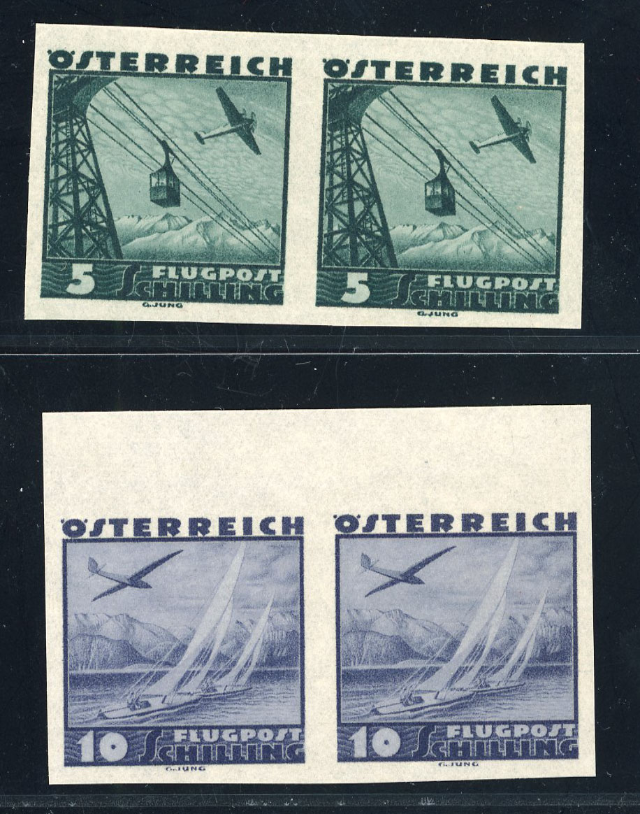 1935, Flugpost kompletter Satz als sogenannte Imprimaturabzüge in den Originalen ähnlichen Farben in waagrechten UNGEZÄHNTEN postfrischen Paaren (meist Randstücke), sehr selten, alle signiert Wallner und Attest Soecknick, ANK und Mi