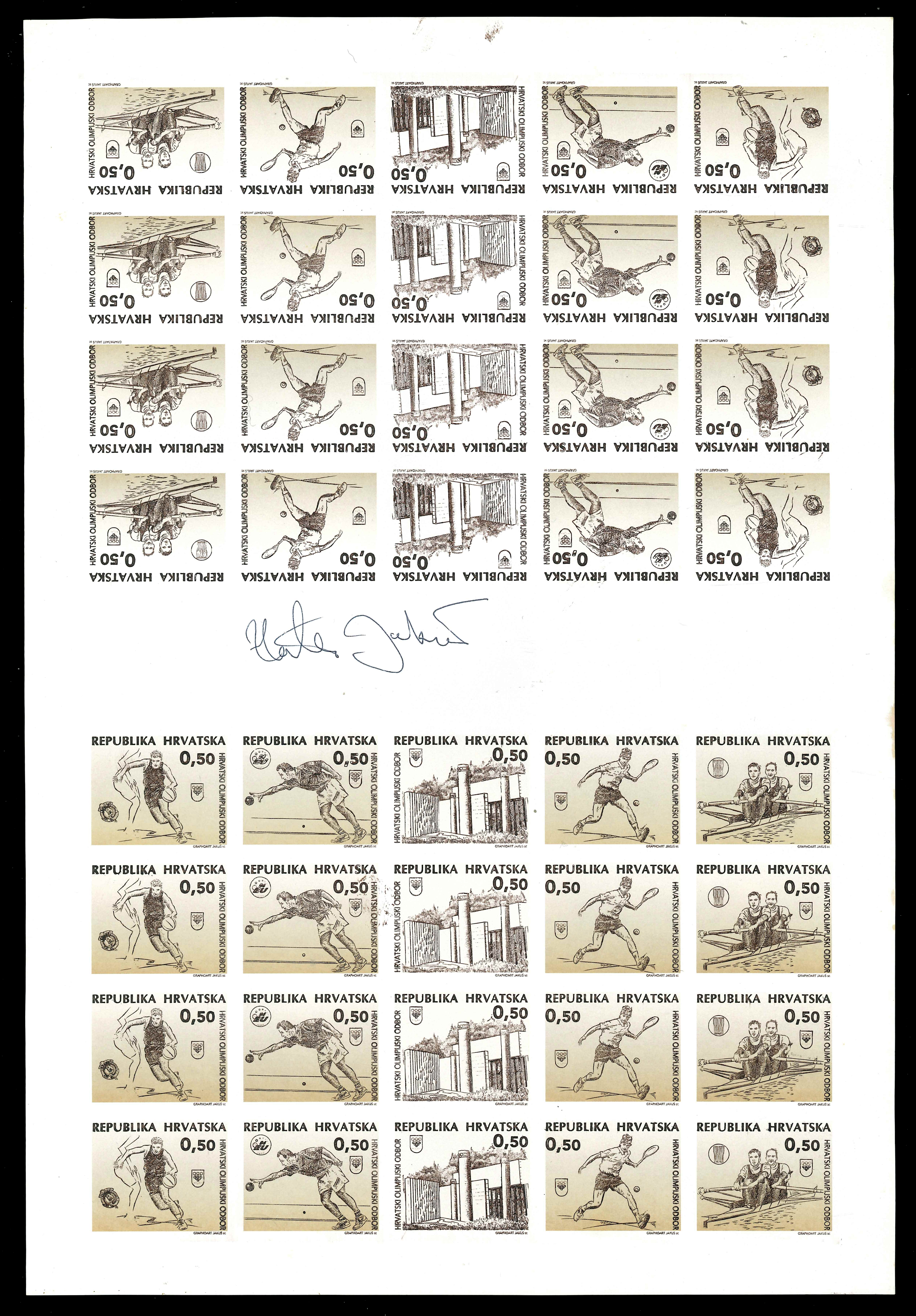 1995, Additional tax stamps fror National Olympic Committee 0,50K in complete IMPERFORATE tete-beche sheet of 20 each without coloured underprint, MNH, sign. by engraver, scarce item (Image 1)