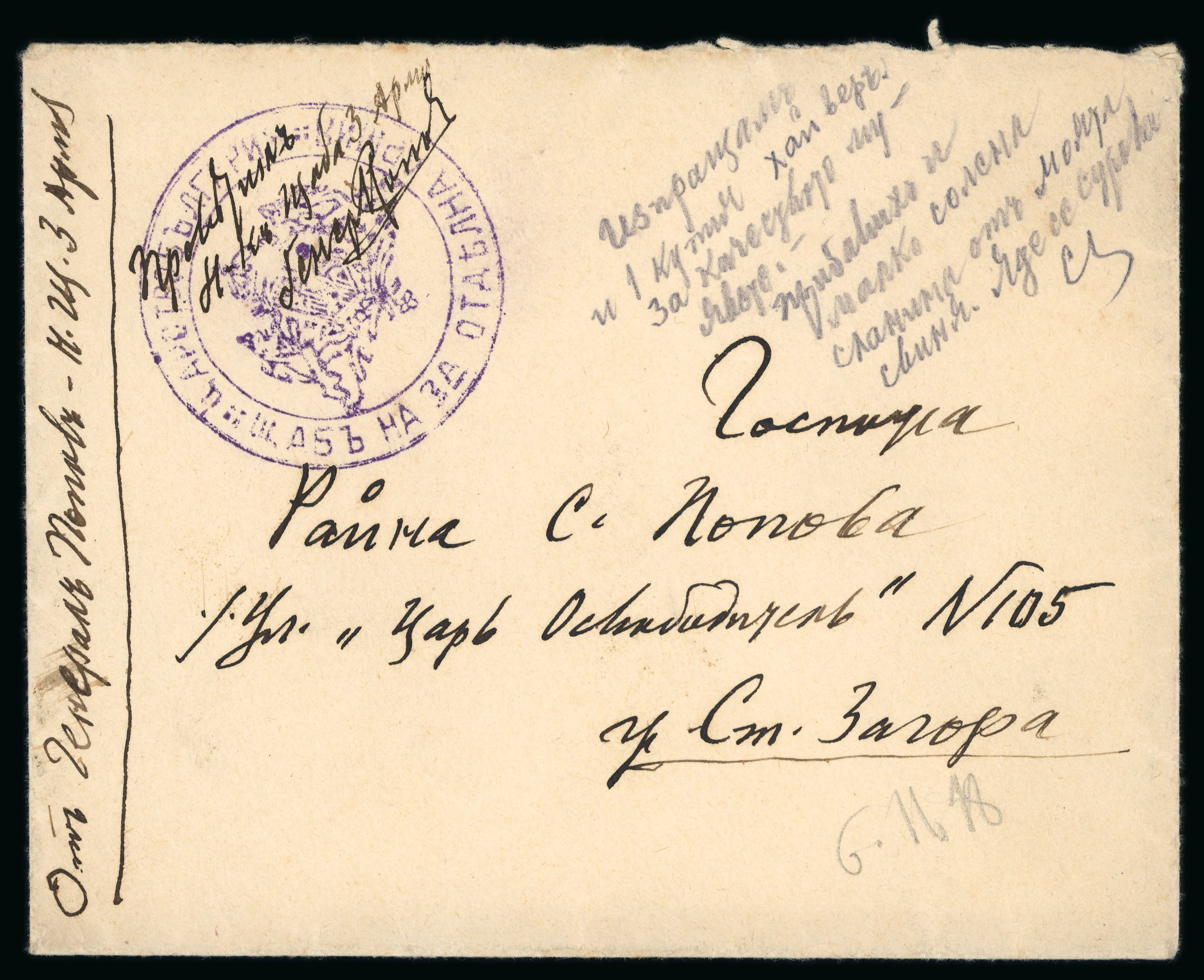 1918 stampless cover from 3rd Army from General Popov with his signature over the military cachet, plusat right in pencil "Inspected by Chief of Staff of the 3rd Army General Popov". Generals censoring their own mail. (Image 1)