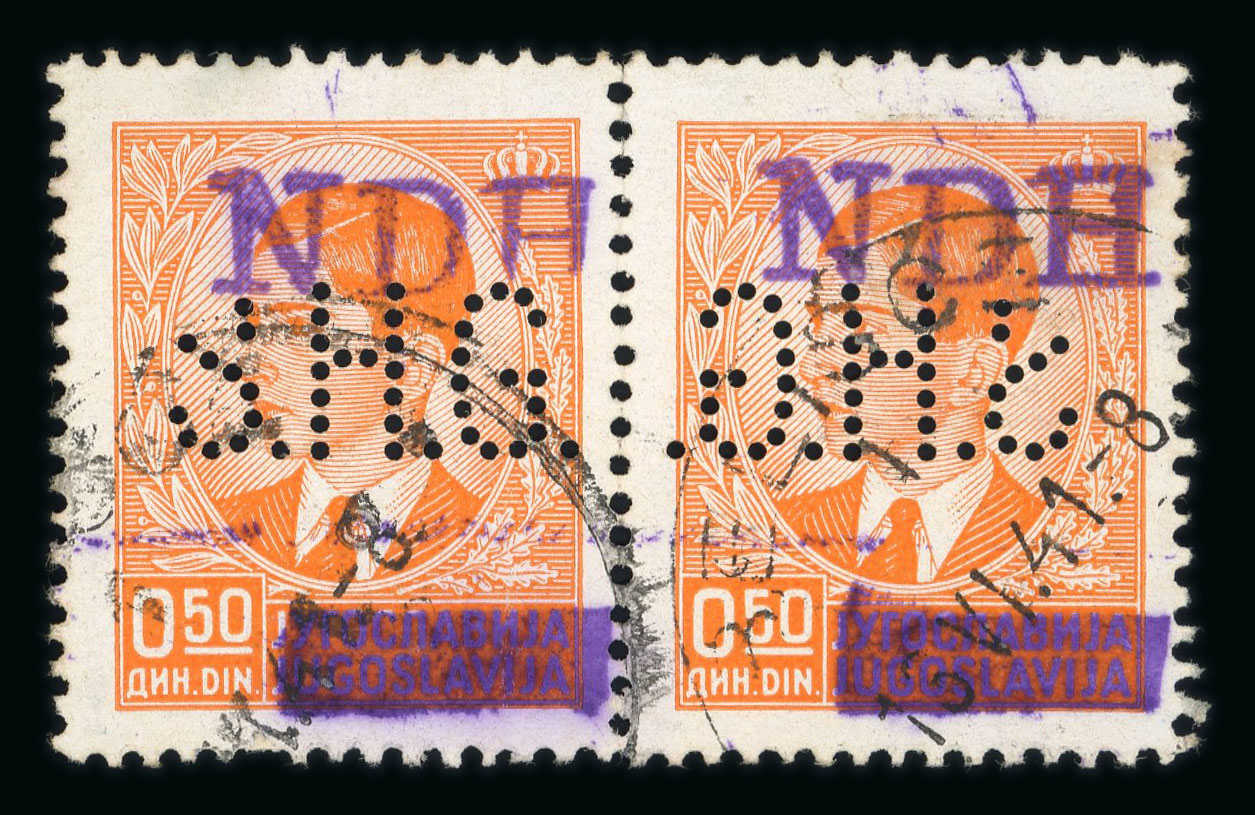 1941 stamps of Kingdom of Serbia with violet obliteration and NDH handstamp applied, each with S.H.G. perfin of the Salomon Heinrich Gutmann company, a 0.50d pair with mirror image perfins and 2d inverted; fine short lived items, Dr