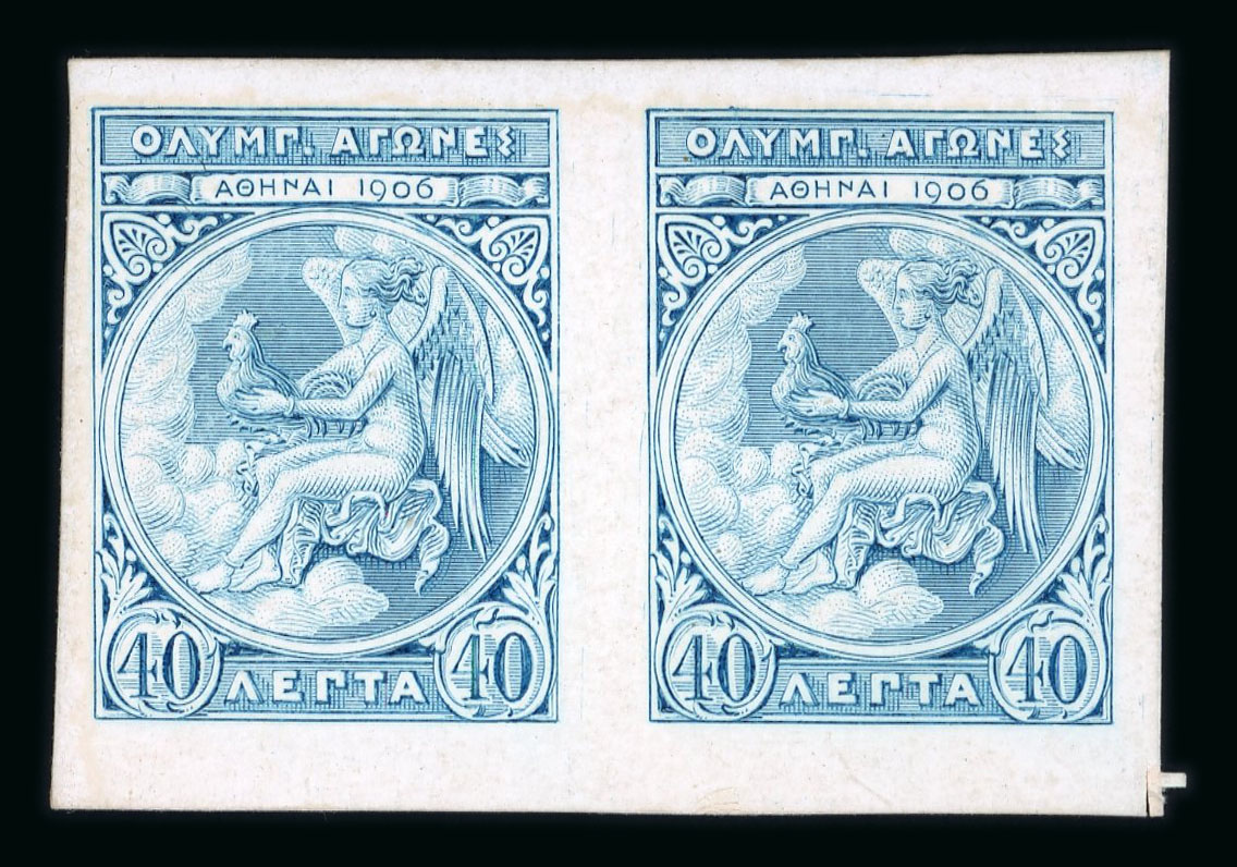 1896 Olympics 20L Die proof in black on carton paper showing the value tablets altered from '20' to '40', the paper a lile disturbed on reverse from mounting, with stamp in issued colour, an unlikely imperf for comparison. (Image 1)