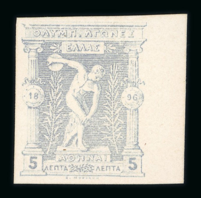 1896 Olympics 5L Die proof from the original plate on carton paper in pale grey, imperf right marginal single, very fine. (Image 1)