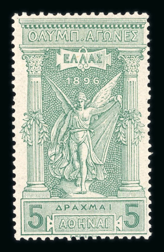 1896 Olympics 5D proof in green, a left-hand marginal, close margin at base, two horizontal creases mint n.h. (Image 1)