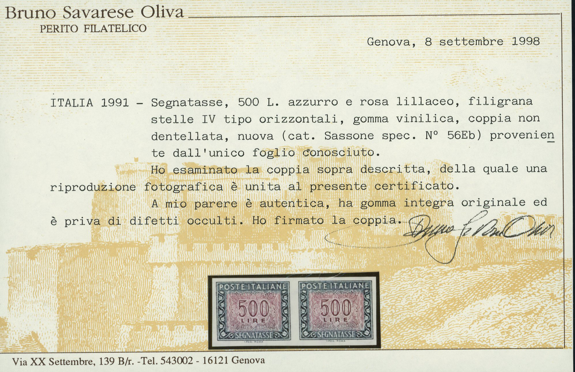 1991 Postage Due 500L. blue and rose-lilac imperf horizontal pair fine mint n.h., B Oliva Cert (1998) (Image 1)