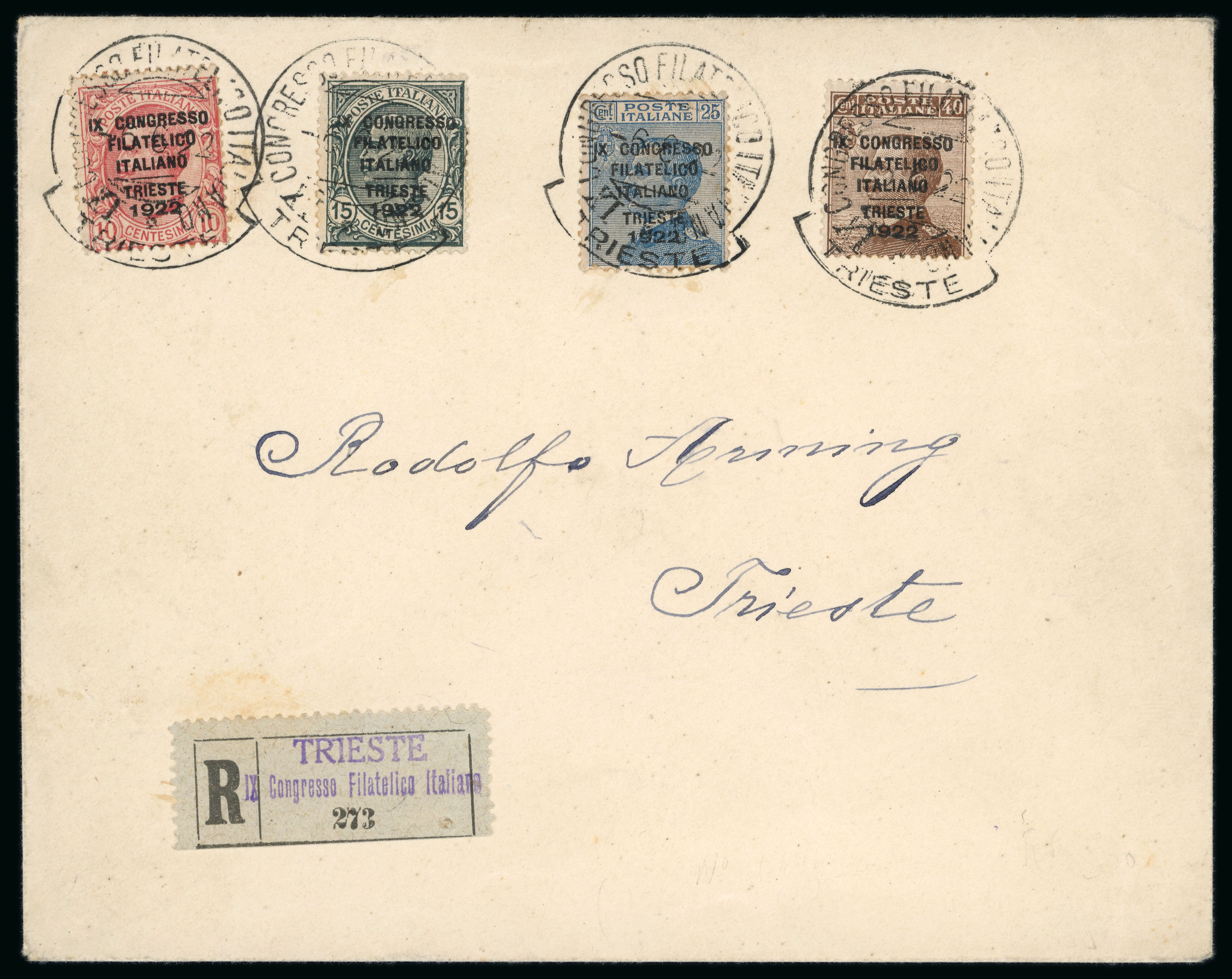 1922, Trieste Philatelic Congress complete set used on a registered cover, congressional postmarks, very fine. (Image 1)