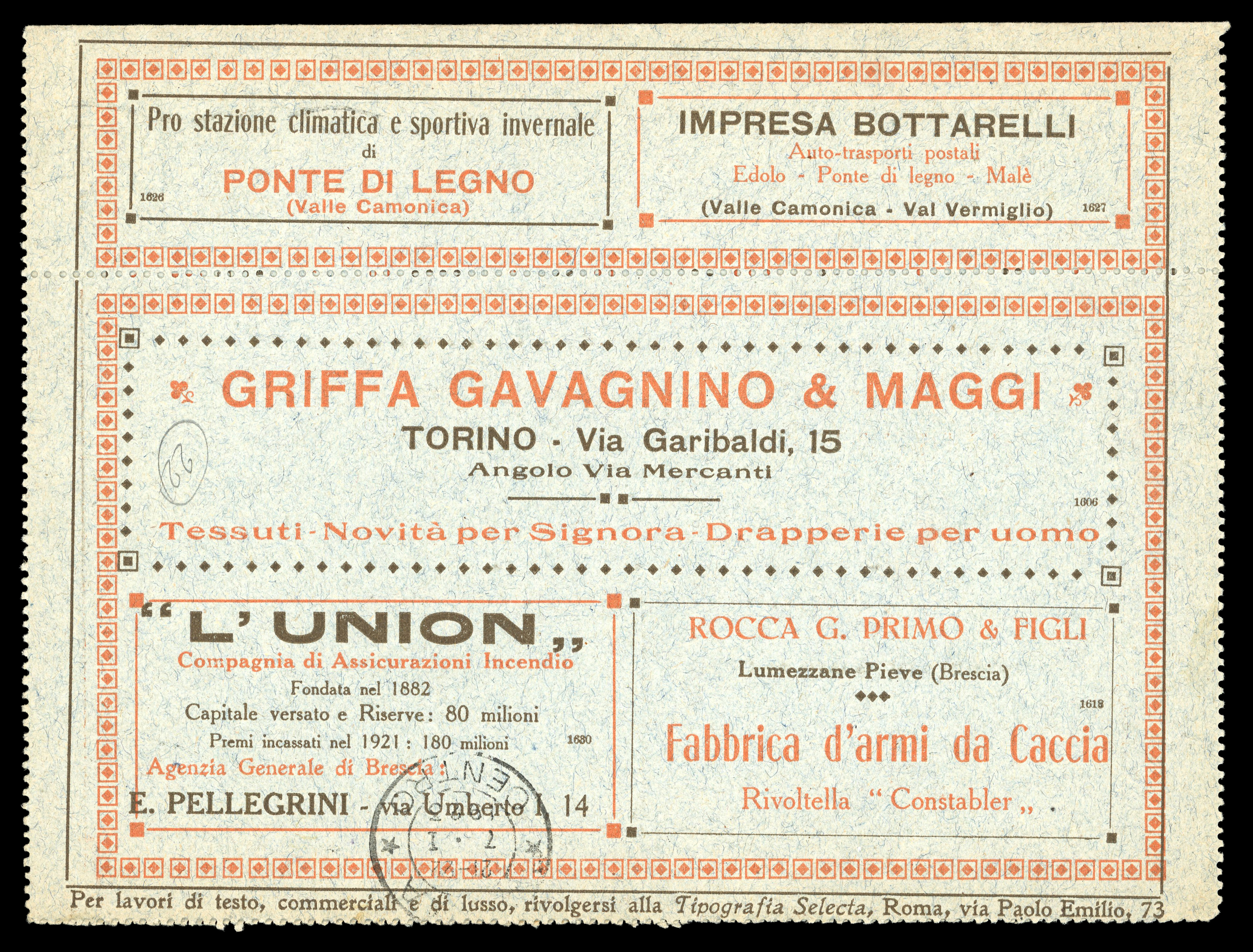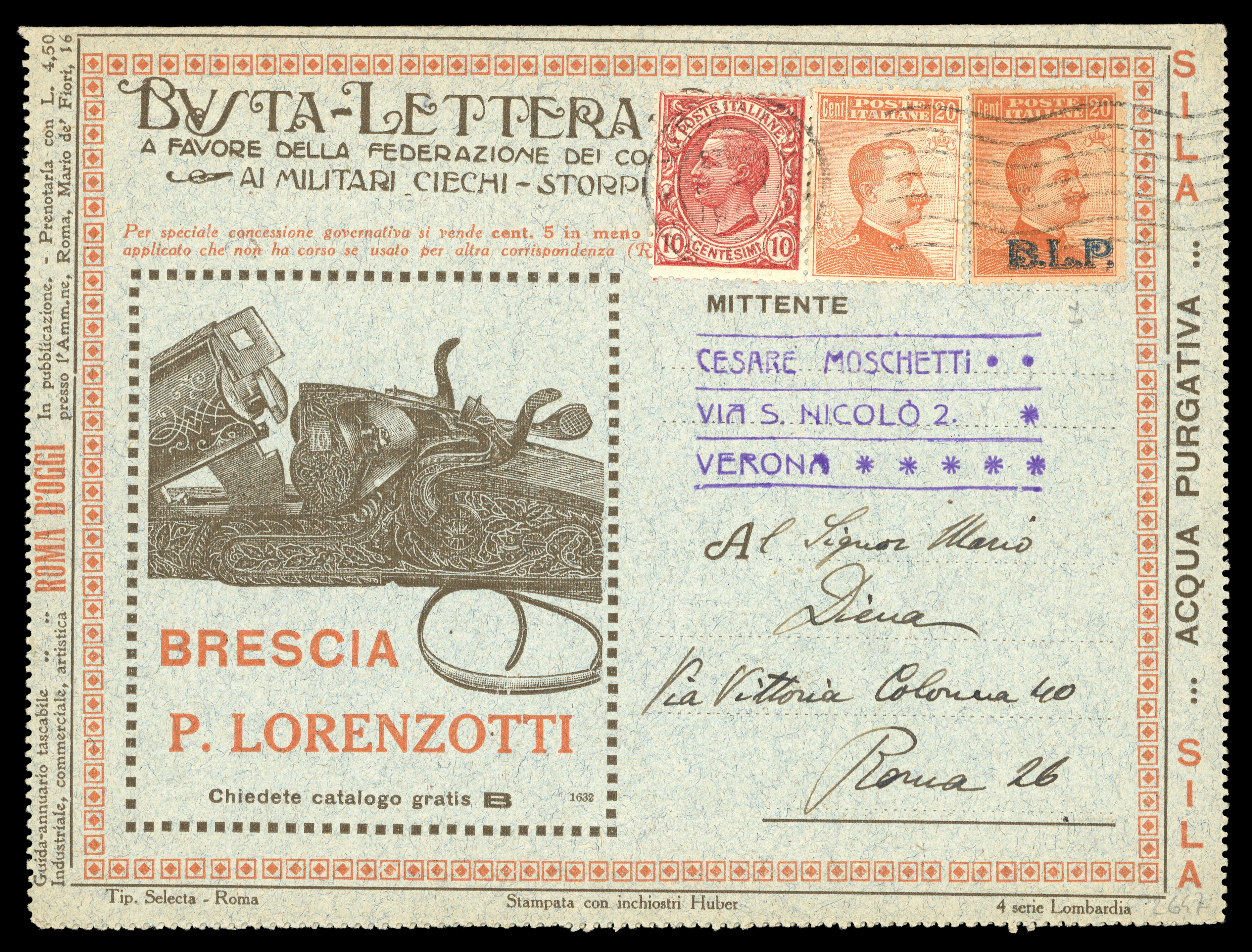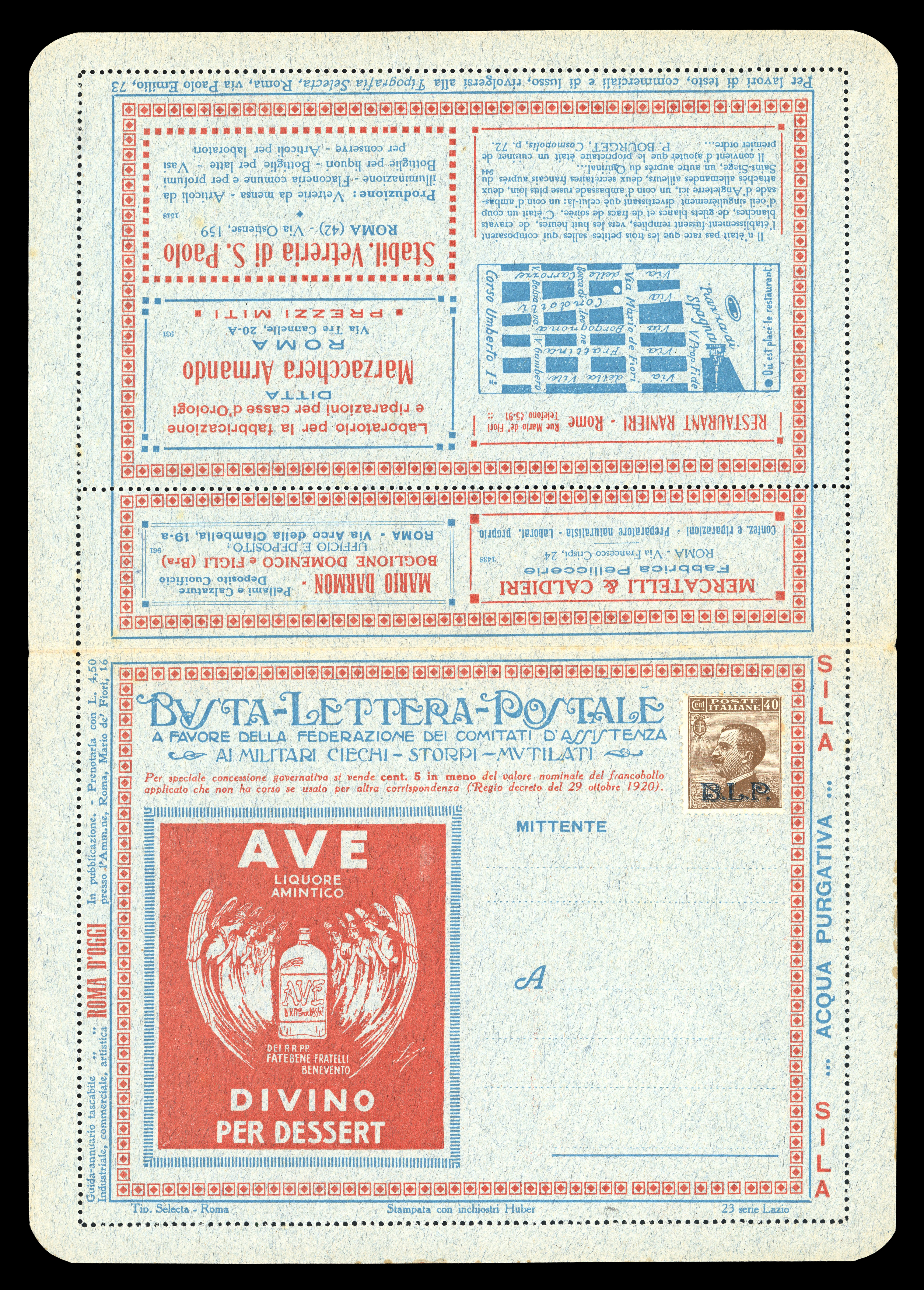 1922-23 "B.L.P." (Busta Lettera Postale = Postal Publicity Stamp) overprint on 40c stamp (13½mm opt. in litho, dark blue) unused on complete lettercard. Generally good condition, but just very slight ageing/touches of toning. Stamp itself